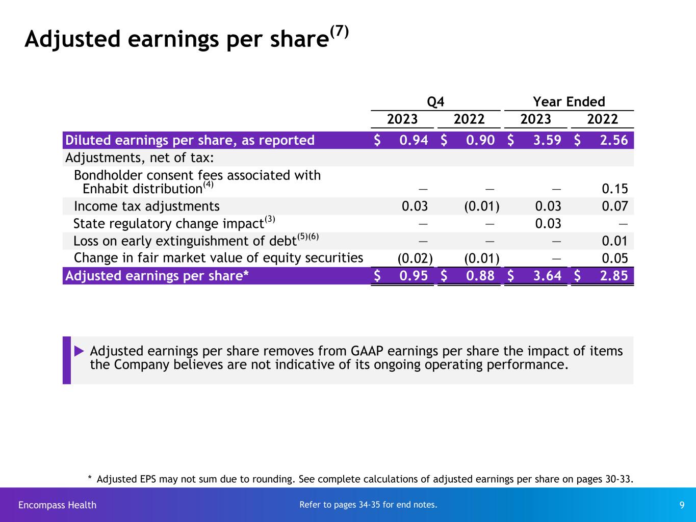 Encompass Health 8 Earnings per share - as reported Q4 Year Ended ($ in millions, except per share data) 2023 2022 2023 2022 Adjusted EBITDA $ 255.0 $ 232.7 $ 971.1 $ 819.3 Depreciation and amortization(3) (70.1) (63.3) (273.9) (243.6) Interest expense and amortization of debt discounts and fees(4) (34.9) (37.5) (143.5) (175.7) Stock-based compensation (13.4) (8.1) (50.6) (29.2) Loss on disposal or impairment of assets (6.1) (2.4) (9.8) (4.8) 130.5 121.4 493.3 366.0 Items not indicative of ongoing operating performance: Loss on early extinguishment of debt(5)(6) — — — (1.4) State regulatory change impact on noncontrolling interests(3) — — 2.2 — Change in fair market value of equity securities 2.8 1.4 0.7 (7.4) Pre-tax income 133.3 122.8 496.2 357.2 Income tax expense (37.2) (31.9) (132.2) (100.1) Income from continuing operations* $ 96.1 $ 90.9 $ 364.0 $ 257.1 Diluted shares (see page 26) 101.5 100.8 101.3 100.4 Diluted earnings per share* $ 0.94 $ 0.90 $ 3.59 $ 2.56 * Earnings per share are determined using income from continuing operations attributable to Encompass Health. Reconciliations to GAAP provided on pages 27-33. Refer to pages 34-35 for end notes. u EPS increased primarily due to growth of Adjusted EBITDA partly offset by higher depreciation and amortization, income tax expense, and performance-based stock compensation.