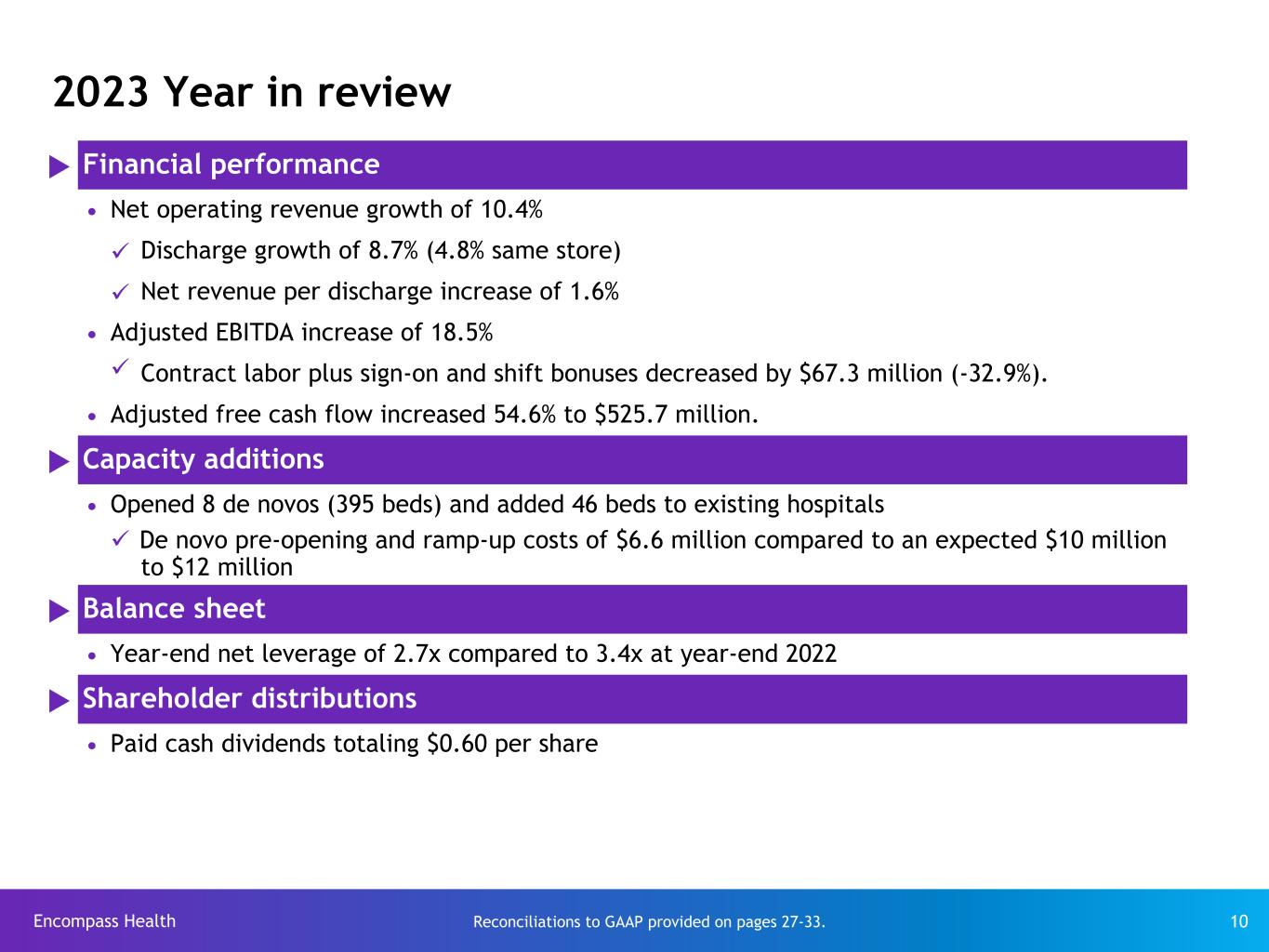 Encompass Health 9 Adjusted earnings per share(7) Refer to pages 34-35 for end notes. Q4 Year Ended 2023 2022 2023 2022 Diluted earnings per share, as reported $ 0.94 $ 0.90 $ 3.59 $ 2.56 Adjustments, net of tax: Bondholder consent fees associated with Enhabit distribution(4) — — — 0.15 Income tax adjustments 0.03 (0.01) 0.03 0.07 State regulatory change impact(3) — — 0.03 — Loss on early extinguishment of debt(5)(6) — — — 0.01 Change in fair market value of equity securities (0.02) (0.01) — 0.05 Adjusted earnings per share* $ 0.95 $ 0.88 $ 3.64 $ 2.85 u Adjusted earnings per share removes from GAAP earnings per share the impact of items the Company believes are not indicative of its ongoing operating performance. * Adjusted EPS may not sum due to rounding. See complete calculations of adjusted earnings per share on pages 30-33.