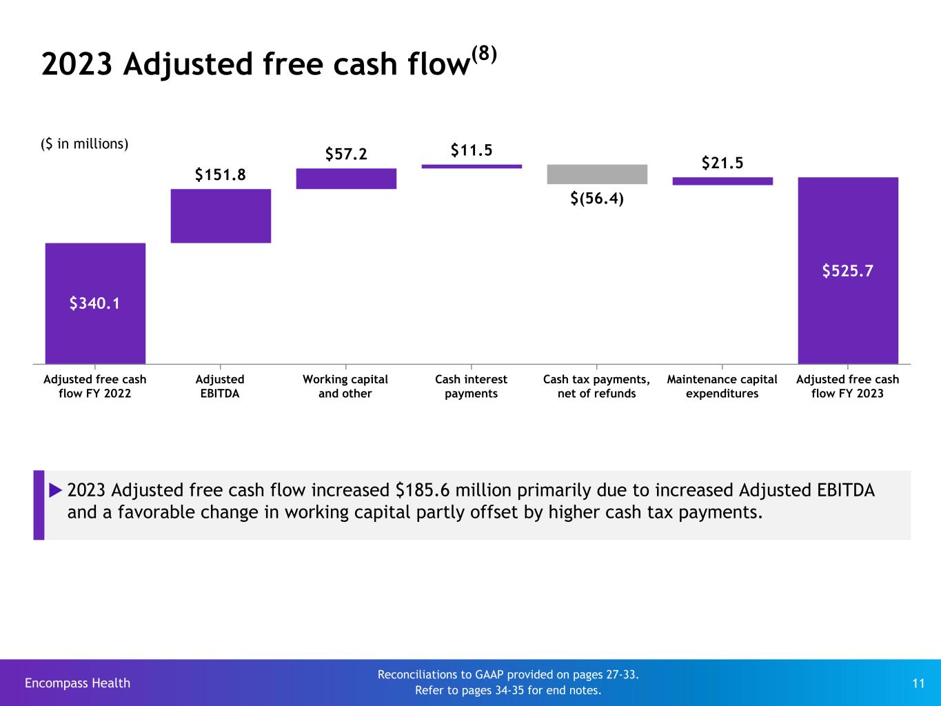 Encompass Health 10 2023 Year in review u Financial performance Ÿ Net operating revenue growth of 10.4% ü Discharge growth of 8.7% (4.8% same store) ü Net revenue per discharge increase of 1.6% Ÿ Adjusted EBITDA increase of 18.5% ü Contract labor plus sign-on and shift bonuses decreased by $67.3 million (-32.9%). Ÿ Adjusted free cash flow increased 54.6% to $525.7 million. u Capacity additions Ÿ Opened 8 de novos (395 beds) and added 46 beds to existing hospitals üNet De novo pre-opening and ramp-up costs of $6.6 million compared to an expected $10 million to $12 million u Balance sheet Ÿ Year-end net leverage of 2.7x compared to 3.4x at year-end 2022 u Shareholder distributions Ÿ Paid cash dividends totaling $0.60 per share Reconciliations to GAAP provided on pages 27-33.
