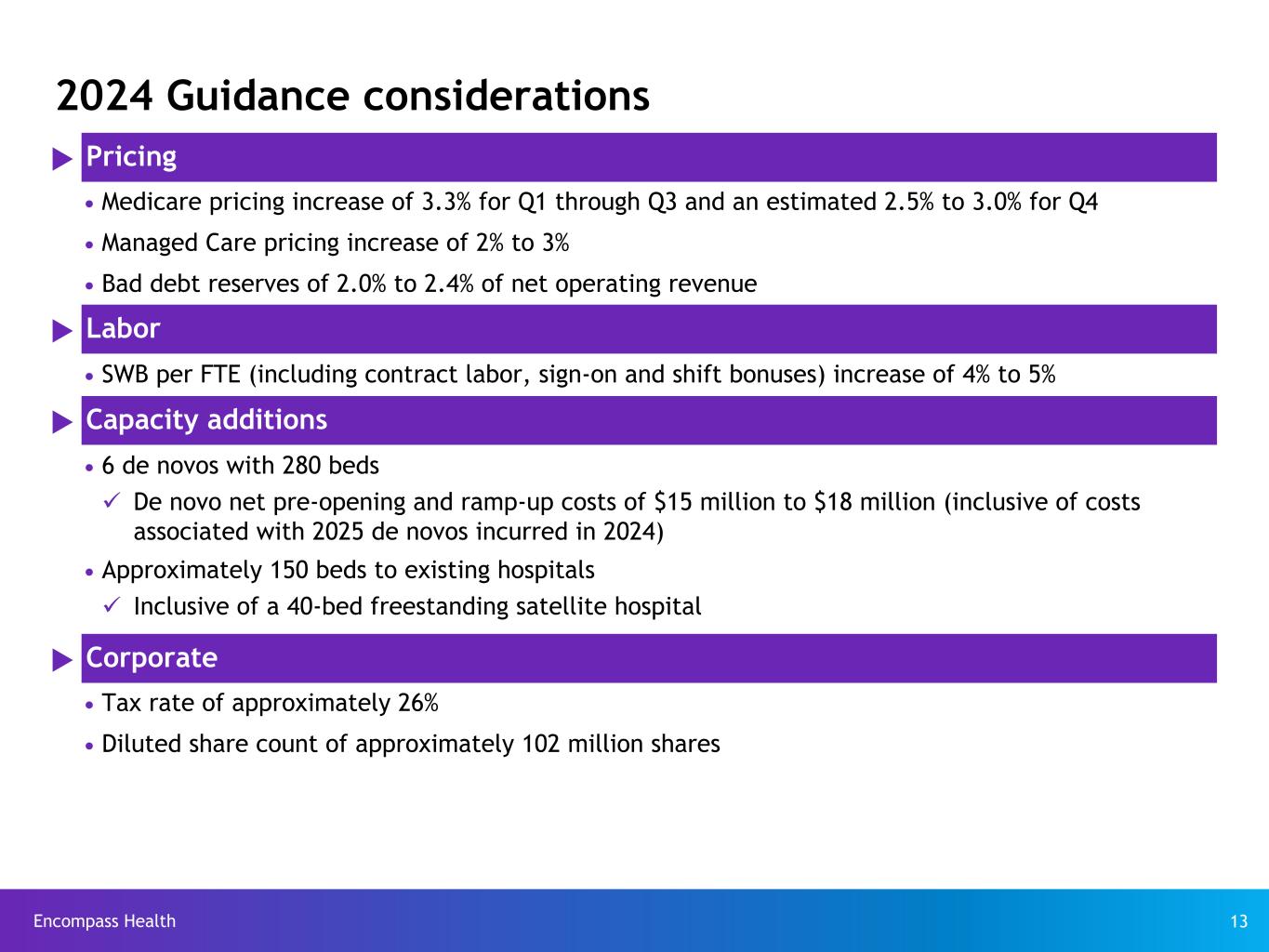 Encompass Health 12 2024 Guidance 2023 Actuals 2024 Guidance ($ in millions, except per share data) Net Operating Revenue $4,801.2 $5,200 to $5,300 Adjusted EBITDA(2) $971.1 $1,015 to $1,055 Adjusted earnings per share from continuing operations attributable to Encompass Health(7) $3.64 $3.77 to $4.06 Refer to pages 34-35 for end notes.