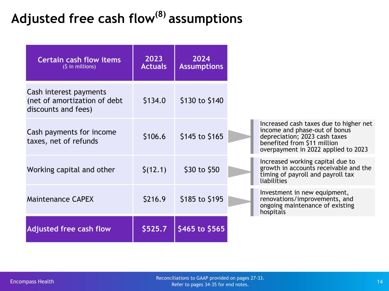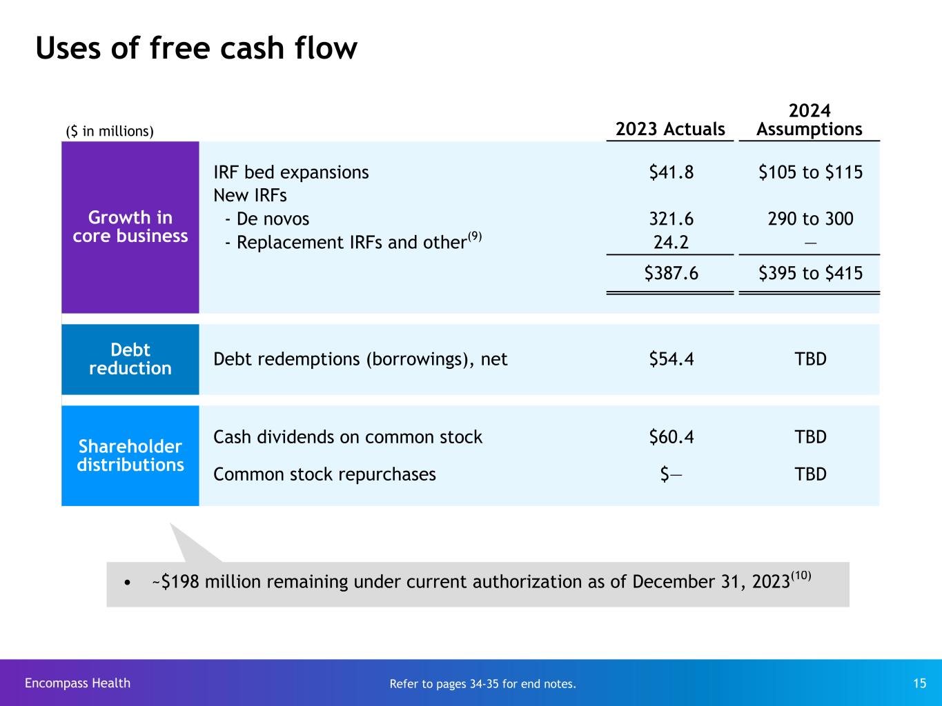 Encompass Health 14 Adjusted free cash flow(8) assumptions Certain cash flow items ($ in millions) 2023 Actuals 2024 Assumptions Cash interest payments (net of amortization of debt discounts and fees) $134.0 $130 to $140 Cash payments for income taxes, net of refunds $106.6 $145 to $165 Working capital and other $(12.1) $30 to $50 Maintenance CAPEX $216.9 $185 to $195 Adjusted free cash flow $525.7 $465 to $565 Increased cash taxes due to higher net income and phase-out of bonus depreciation; 2023 cash taxes benefited from $11 million overpayment in 2022 applied to 2023 Increased working capital due to growth in accounts receivable and the timing of payroll and payroll tax liabilities Investment in new equipment, renovations/improvements, and ongoing maintenance of existing hospitals Reconciliations to GAAP provided on pages 27-33. Refer to pages 34-35 for end notes.