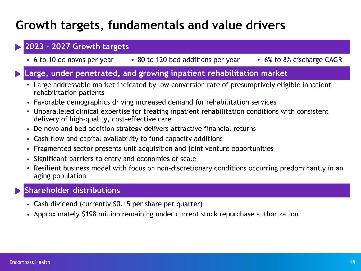 Encompass Health 17 ~38,100 employees Rehabilitation hospitals “IRFs” IRFs under development* * IRFs under development - previously announced under development as of February 7, 2024 † Based on 2022 and 2021 data Encompass Health Largest owner and operator of rehabilitation hospitals Company profile as of 12/31/23 161 Rehabilitation hospitals “IRFs” 63 are joint ventures 17 37 IRFs under development* States and Puerto Rico 25% of Licensed beds † 33% of Medicare patients served † Key statistics trailing four quarters ~229,500 patient discharges ~$4.8 Billion in revenue