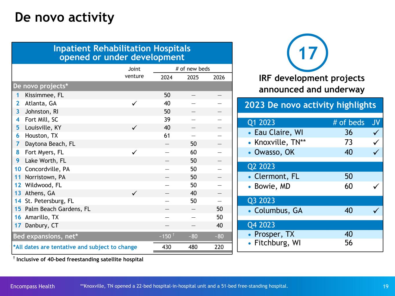 Encompass Health 19 Inpatient Rehabilitation Hospitals opened or under development Joint venture # of new beds 2024 2025 2026 De novo projects* 1 Kissimmee, FL 50 — — 2 Atlanta, GA ü 40 — — 3 Johnston, RI 50 — — 4 Fort Mill, SC 39 — — 5 Louisville, KY ü 40 — — 6 Houston, TX 61 — — 7 Daytona Beach, FL — 50 — 8 Fort Myers, FL ü — 60 — 9 Lake Worth, FL — 50 — 10 Concordville, PA — 50 — 11 Norristown, PA — 50 — 12 Wildwood, FL — 50 — 13 Athens, GA ü — 40 — 14 St. Petersburg, FL — 50 — 15 Palm Beach Gardens, FL — — 50 16 Amarillo, TX — — 50 17 Danbury, CT — — 40 Bed expansions, net* ~150 † ~80 ~80 *All dates are tentative and subject to change 430 480 220 † Inclusive of 40-bed freestanding satellite hospital De novo activity 2023 De novo activity highlights u Q1 2023 # of beds JV Ÿ Eau Claire, WI 36 ü Ÿ Knoxville, TN** 73 ü Ÿ Owasso, OK 40 ü u Q2 2023 Ÿ Clermont, FL 50 Ÿ Bowie, MD 60 ü u Q3 2023 Ÿ Columbus, GA 40 ü u Q4 2023 Ÿ Prosper, TX 40 Ÿ Fitchburg, WI 56 IRF development projects announced and underway 17 **Knoxville, TN opened a 22-bed hospital-in-hospital unit and a 51-bed free-standing hospital.