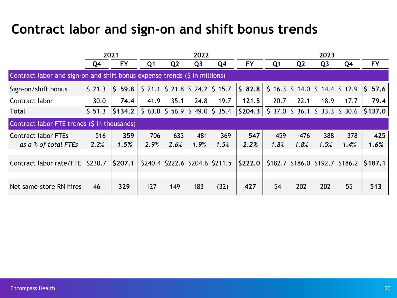 Encompass Health 20 Contract labor and sign-on and shift bonus trends 2021 2022 2023 Q4 FY Q1 Q2 Q3 Q4 FY Q1 Q2 Q3 Q4 FY Contract labor and sign-on and shift bonus expense trends ($ in millions) Sign-on/shift bonus $ 21.3 $ 59.8 $ 21.1 $ 21.8 $ 24.2 $ 15.7 $ 82.8 $ 16.3 $ 14.0 $ 14.4 $ 12.9 $ 57.6 Contract labor 30.0 74.4 41.9 35.1 24.8 19.7 121.5 20.7 22.1 18.9 17.7 79.4 Total $ 51.3 $ 134.2 $ 63.0 $ 56.9 $ 49.0 $ 35.4 $ 204.3 $ 37.0 $ 36.1 $ 33.3 $ 30.6 $ 137.0 Contract labor FTE trends ($ in thousands) Contract labor FTEs 516 359 706 633 481 369 547 459 476 388 378 425 as a % of total FTEs 2.2% 1.5% 2.9% 2.6% 1.9% 1.5% 2.2% 1.8% 1.8% 1.5% 1.4% 1.6% Contract labor rate/FTE $ 230.7 $ 207.1 $ 240.4 $ 222.6 $ 204.6 $ 211.5 $ 222.0 $ 182.7 $ 186.0 $ 192.7 $ 186.2 $ 187.1 Net same-store RN hires 46 329 127 149 183 (32) 427 54 202 202 55 513