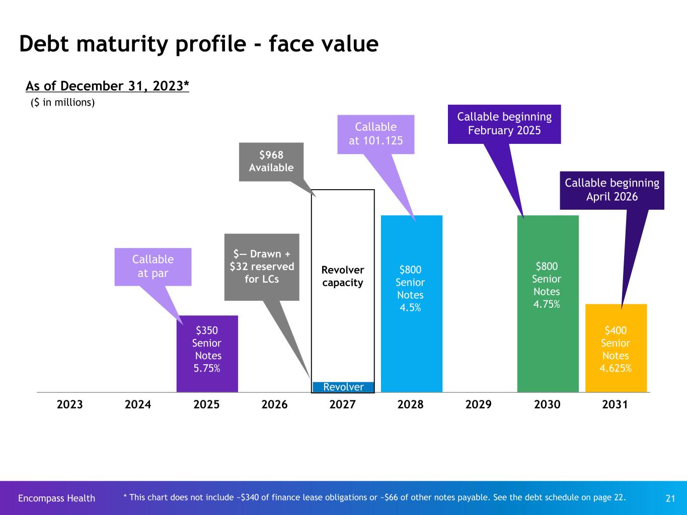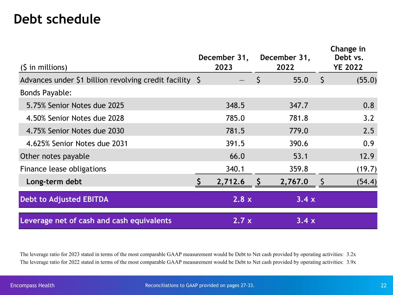 Encompass Health 21 2023 2024 2025 2026 2027 2028 2029 2030 2031 * This chart does not include ~$340 of finance lease obligations or ~$66 of other notes payable. See the debt schedule on page 22. Debt maturity profile - face value $350 Senior Notes 5.75% ($ in millions) Revolver capacity $800 Senior Notes 4.75% $800 Senior Notes 4.5% Revolver As of December 31, 2023* $968 Available $— Drawn + $32 reserved for LCs Callable at par Callable beginning February 2025Callable at 101.125 $400 Senior Notes 4.625% Callable beginning April 2026