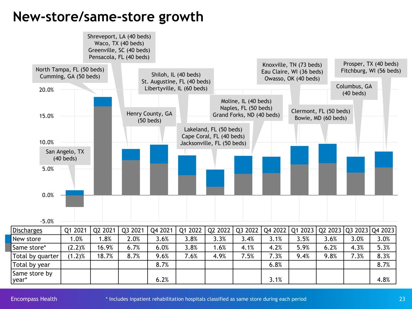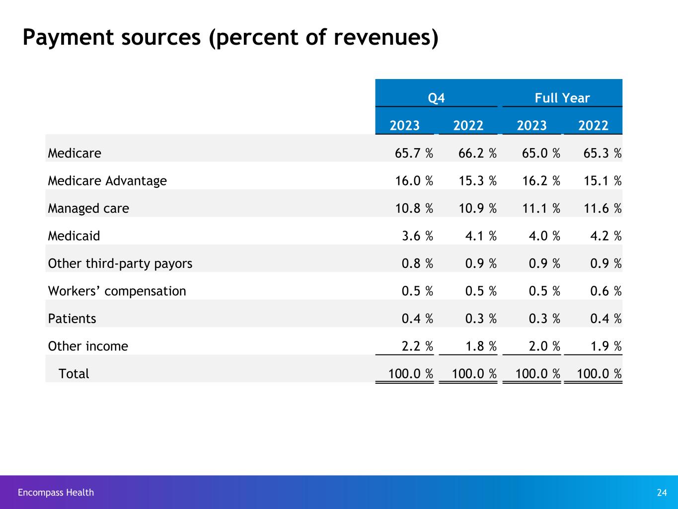 Encompass Health 23 -5.0% 0.0% 5.0% 10.0% 15.0% 20.0% * Includes inpatient rehabilitation hospitals classified as same store during each period New-store/same-store growth North Tampa, FL (50 beds) Cumming, GA (50 beds) Shreveport, LA (40 beds) Waco, TX (40 beds) Greenville, SC (40 beds) Pensacola, FL (40 beds) Discharges Q1 2021 Q2 2021 Q3 2021 Q4 2021 Q1 2022 Q2 2022 Q3 2022 Q4 2022 Q1 2023 Q2 2023 Q3 2023 Q4 2023 New store 1.0% 1.8% 2.0% 3.6% 3.8% 3.3% 3.4% 3.1% 3.5% 3.6% 3.0% 3.0% Same store* (2.2)% 16.9% 6.7% 6.0% 3.8% 1.6% 4.1% 4.2% 5.9% 6.2% 4.3% 5.3% Total by quarter (1.2)% 18.7% 8.7% 9.6% 7.6% 4.9% 7.5% 7.3% 9.4% 9.8% 7.3% 8.3% Total by year 8.7% 6.8% 8.7% Same store by year* 6.2% 3.1% 4.8% San Angelo, TX (40 beds) Shiloh, IL (40 beds) St. Augustine, FL (40 beds) Libertyville, IL (60 beds) Henry County, GA (50 beds) Moline, IL (40 beds) Naples, FL (50 beds) Grand Forks, ND (40 beds) Lakeland, FL (50 beds) Cape Coral, FL (40 beds) Jacksonville, FL (50 beds) Knoxville, TN (73 beds) Eau Claire, WI (36 beds) Owasso, OK (40 beds) Clermont, FL (50 beds) Bowie, MD (60 beds) Columbus, GA (40 beds) Prosper, TX (40 beds) Fitchburg, WI (56 beds)