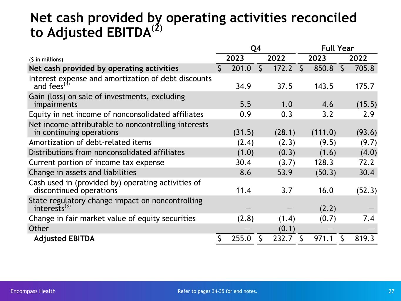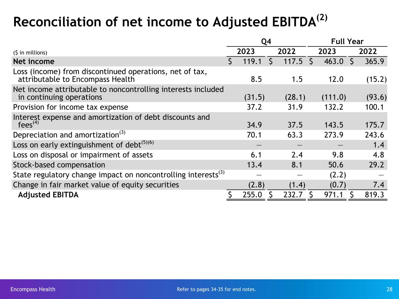 Encompass Health 27 Net cash provided by operating activities reconciled to Adjusted EBITDA(2) Q4 Full Year ($ in millions) 2023 2022 2023 2022 Net cash provided by operating activities $ 201.0 $ 172.2 $ 850.8 $ 705.8 Interest expense and amortization of debt discounts and fees(4) 34.9 37.5 143.5 175.7 Gain (loss) on sale of investments, excluding impairments 5.5 1.0 4.6 (15.5) Equity in net income of nonconsolidated affiliates 0.9 0.3 3.2 2.9 Net income attributable to noncontrolling interests in continuing operations (31.5) (28.1) (111.0) (93.6) Amortization of debt-related items (2.4) (2.3) (9.5) (9.7) Distributions from nonconsolidated affiliates (1.0) (0.3) (1.6) (4.0) Current portion of income tax expense 30.4 (3.7) 128.3 72.2 Change in assets and liabilities 8.6 53.9 (50.3) 30.4 Cash used in (provided by) operating activities of discontinued operations 11.4 3.7 16.0 (52.3) State regulatory change impact on noncontrolling interests(3) — — (2.2) — Change in fair market value of equity securities (2.8) (1.4) (0.7) 7.4 Other — (0.1) — — Adjusted EBITDA $ 255.0 $ 232.7 $ 971.1 $ 819.3 Refer to pages 34-35 for end notes.
