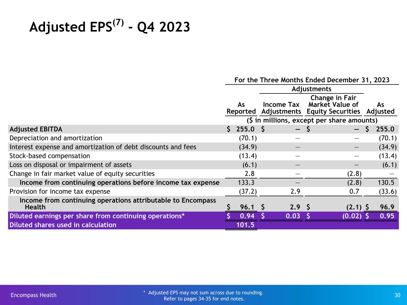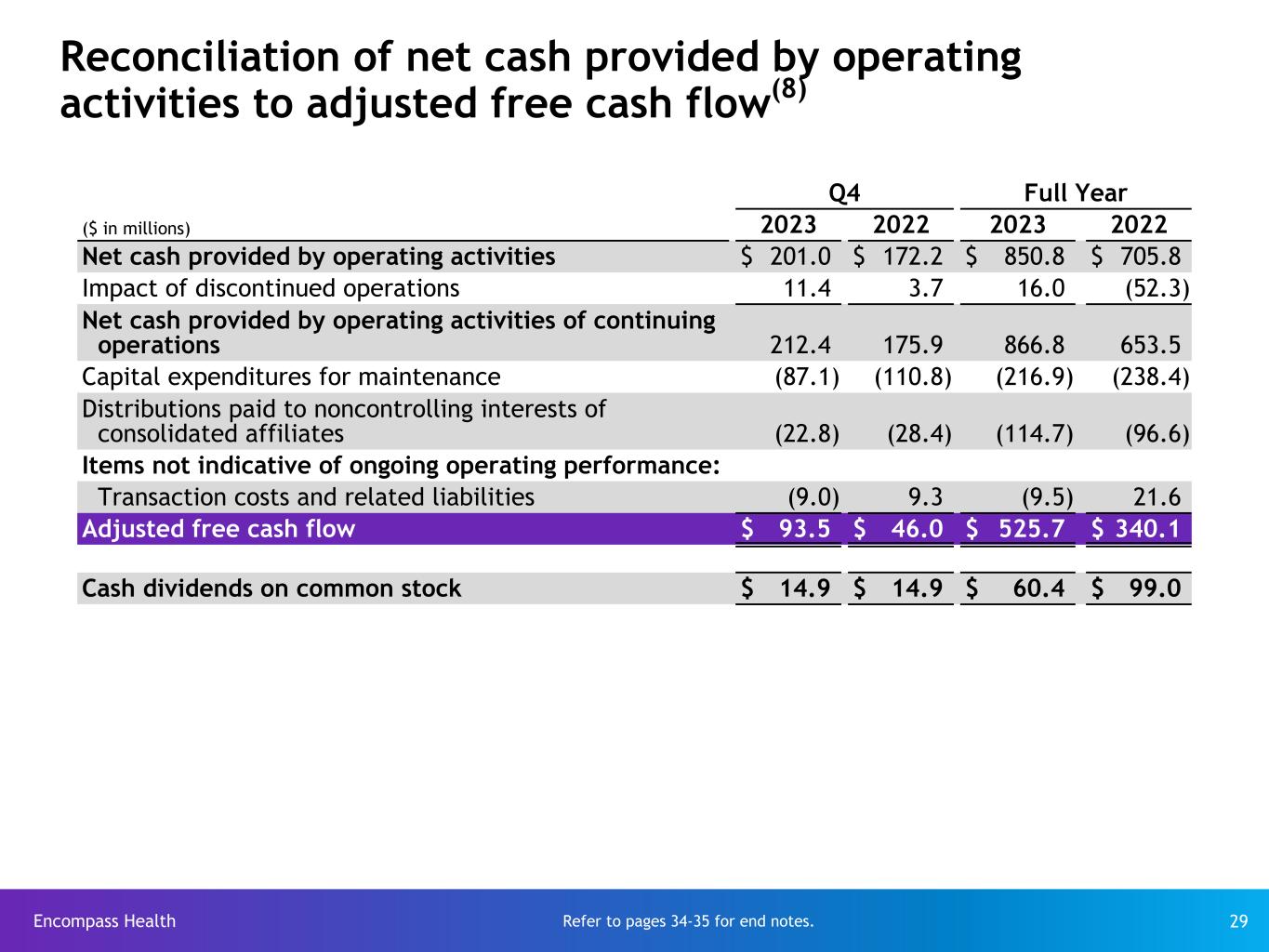 Encompass Health 29 Reconciliation of net cash provided by operating activities to adjusted free cash flow(8) Q4 Full Year ($ in millions) 2023 2022 2023 2022 Net cash provided by operating activities $ 201.0 $ 172.2 $ 850.8 $ 705.8 Impact of discontinued operations 11.4 3.7 16.0 (52.3) Net cash provided by operating activities of continuing operations 212.4 175.9 866.8 653.5 Capital expenditures for maintenance (87.1) (110.8) (216.9) (238.4) Distributions paid to noncontrolling interests of consolidated affiliates (22.8) (28.4) (114.7) (96.6) Items not indicative of ongoing operating performance: Transaction costs and related liabilities (9.0) 9.3 (9.5) 21.6 Adjusted free cash flow $ 93.5 $ 46.0 $ 525.7 $ 340.1 Cash dividends on common stock $ 14.9 $ 14.9 $ 60.4 $ 99.0 Refer to pages 34-35 for end notes.