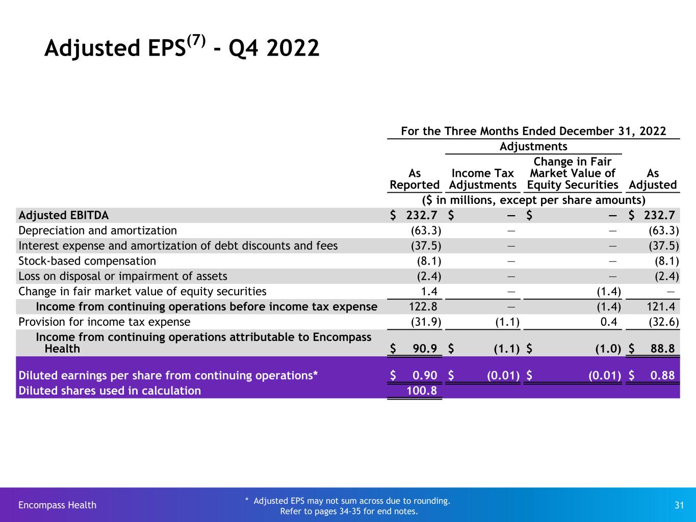 Encompass Health 30 Adjusted EPS(7) - Q4 2023 For the Three Months Ended December 31, 2023 Adjustments As Reported Income Tax Adjustments Change in Fair Market Value of Equity Securities As Adjusted ($ in millions, except per share amounts) Adjusted EBITDA $ 255.0 $ — $ — $ 255.0 Depreciation and amortization (70.1) — — (70.1) Interest expense and amortization of debt discounts and fees (34.9) — — (34.9) Stock-based compensation (13.4) — — (13.4) Loss on disposal or impairment of assets (6.1) — — (6.1) Change in fair market value of equity securities 2.8 — (2.8) — Income from continuing operations before income tax expense 133.3 — (2.8) 130.5 Provision for income tax expense (37.2) 2.9 0.7 (33.6) Income from continuing operations attributable to Encompass Health $ 96.1 $ 2.9 $ (2.1) $ 96.9 Diluted earnings per share from continuing operations* $ 0.94 $ 0.03 $ (0.02) $ 0.95 Diluted shares used in calculation 101.5 * Adjusted EPS may not sum across due to rounding. Refer to pages 34-35 for end notes.