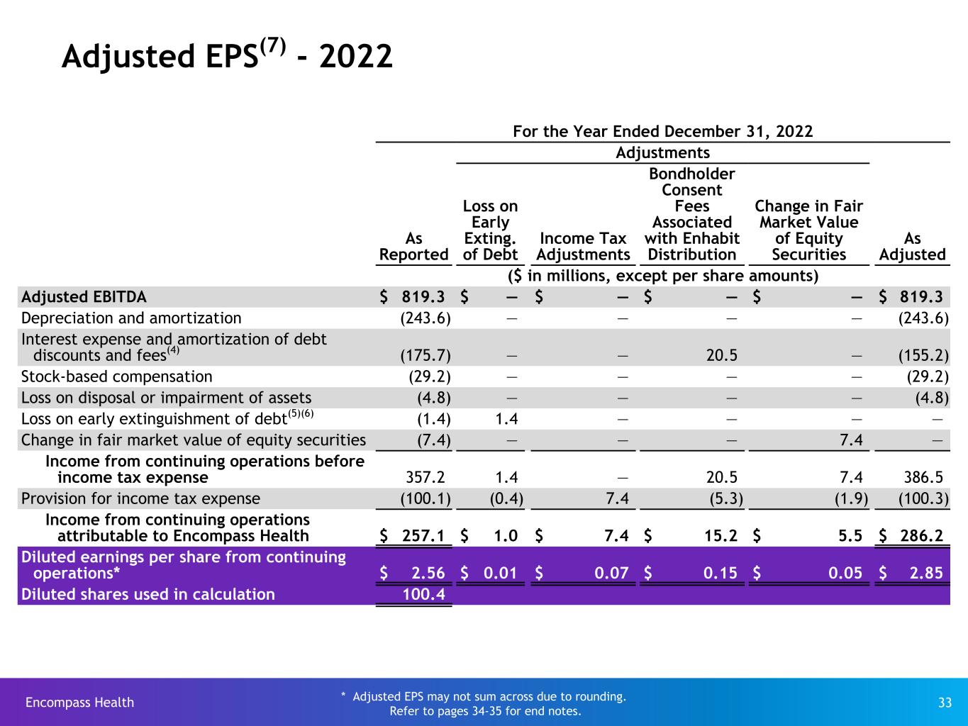 Encompass Health 32 Adjusted EPS(7) - 2023 For the Year Ended December 31, 2023 Adjustments As Reported State Regulatory Change Impact Income Tax Adjustments Change in Fair Market Value of Equity Securities As Adjusted ($ in millions, except per share amounts) Adjusted EBITDA $ 971.1 $ — $ — $ — $ 971.1 Depreciation and amortization(3) (273.9) 6.1 — — (267.8) Interest expense and amortization of debt discounts and fees (143.5) — — — (143.5) Stock-based compensation (50.6) — — — (50.6) Loss on disposal or impairment of assets (9.8) — — — (9.8) State regulatory change impact on noncontrolling interests(3) 2.2 (2.2) — — — Change in fair market value of equity securities 0.7 — — (0.7) — Income from continuing operations before income tax expense 496.2 3.9 — (0.7) 499.4 Provision for income tax expense (132.2) (1.0) 2.8 0.2 (130.2) Income from continuing operations attributable to Encompass Health $ 364.0 $ 2.9 $ 2.8 $ (0.5) $ 369.2 Diluted earnings per share from continuing operations* $ 3.59 $ 0.03 $ 0.03 $ — $ 3.64 Diluted shares used in calculation 101.3 * Adjusted EPS may not sum across due to rounding. Refer to pages 34-35 for end notes.