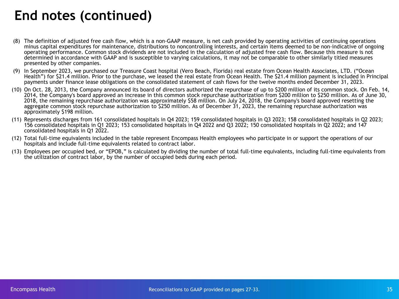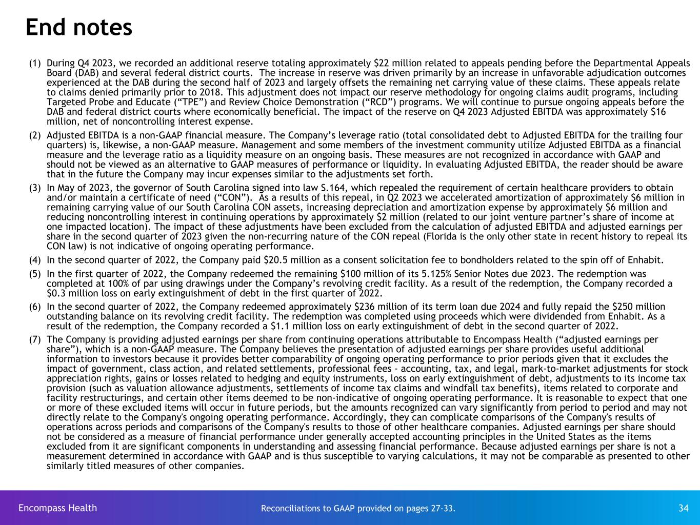 Encompass Health 34 End notes Reconciliations to GAAP provided on pages 27-33. (1) During Q4 2023, we recorded an additional reserve totaling approximately $22 million related to appeals pending before the Departmental Appeals Board (DAB) and several federal district courts. The increase in reserve was driven primarily by an increase in unfavorable adjudication outcomes experienced at the DAB during the second half of 2023 and largely offsets the remaining net carrying value of these claims. These appeals relate to claims denied primarily prior to 2018. This adjustment does not impact our reserve methodology for ongoing claims audit programs, including Targeted Probe and Educate (“TPE”) and Review Choice Demonstration (“RCD”) programs. We will continue to pursue ongoing appeals before the DAB and federal district courts where economically beneficial. The impact of the reserve on Q4 2023 Adjusted EBITDA was approximately $16 million, net of noncontrolling interest expense. (2) Adjusted EBITDA is a non-GAAP financial measure. The Company’s leverage ratio (total consolidated debt to Adjusted EBITDA for the trailing four quarters) is, likewise, a non-GAAP measure. Management and some members of the investment community utilize Adjusted EBITDA as a financial measure and the leverage ratio as a liquidity measure on an ongoing basis. These measures are not recognized in accordance with GAAP and should not be viewed as an alternative to GAAP measures of performance or liquidity. In evaluating Adjusted EBITDA, the reader should be aware that in the future the Company may incur expenses similar to the adjustments set forth. (3) In May of 2023, the governor of South Carolina signed into law S.164, which repealed the requirement of certain healthcare providers to obtain and/or maintain a certificate of need (“CON”). As a results of this repeal, in Q2 2023 we accelerated amortization of approximately $6 million in remaining carrying value of our South Carolina CON assets, increasing depreciation and amortization expense by approximately $6 million and reducing noncontrolling interest in continuing operations by approximately $2 million (related to our joint venture partner’s share of income at one impacted location). The impact of these adjustments have been excluded from the calculation of adjusted EBITDA and adjusted earnings per share in the second quarter of 2023 given the non-recurring nature of the CON repeal (Florida is the only other state in recent history to repeal its CON law) is not indicative of ongoing operating performance. (4) In the second quarter of 2022, the Company paid $20.5 million as a consent solicitation fee to bondholders related to the spin off of Enhabit. (5) In the first quarter of 2022, the Company redeemed the remaining $100 million of its 5.125% Senior Notes due 2023. The redemption was completed at 100% of par using drawings under the Company’s revolving credit facility. As a result of the redemption, the Company recorded a $0.3 million loss on early extinguishment of debt in the first quarter of 2022. (6) In the second quarter of 2022, the Company redeemed approximately $236 million of its term loan due 2024 and fully repaid the $250 million outstanding balance on its revolving credit facility. The redemption was completed using proceeds which were dividended from Enhabit. As a result of the redemption, the Company recorded a $1.1 million loss on early extinguishment of debt in the second quarter of 2022. (7) The Company is providing adjusted earnings per share from continuing operations attributable to Encompass Health (“adjusted earnings per share”), which is a non-GAAP measure. The Company believes the presentation of adjusted earnings per share provides useful additional information to investors because it provides better comparability of ongoing operating performance to prior periods given that it excludes the impact of government, class action, and related settlements, professional fees - accounting, tax, and legal, mark-to-market adjustments for stock appreciation rights, gains or losses related to hedging and equity instruments, loss on early extinguishment of debt, adjustments to its income tax provision (such as valuation allowance adjustments, settlements of income tax claims and windfall tax benefits), items related to corporate and facility restructurings, and certain other items deemed to be non-indicative of ongoing operating performance. It is reasonable to expect that one or more of these excluded items will occur in future periods, but the amounts recognized can vary significantly from period to period and may not directly relate to the Company's ongoing operating performance. Accordingly, they can complicate comparisons of the Company's results of operations across periods and comparisons of the Company's results to those of other healthcare companies. Adjusted earnings per share should not be considered as a measure of financial performance under generally accepted accounting principles in the United States as the items excluded from it are significant components in understanding and assessing financial performance. Because adjusted earnings per share is not a measurement determined in accordance with GAAP and is thus susceptible to varying calculations, it may not be comparable as presented to other similarly titled measures of other companies.