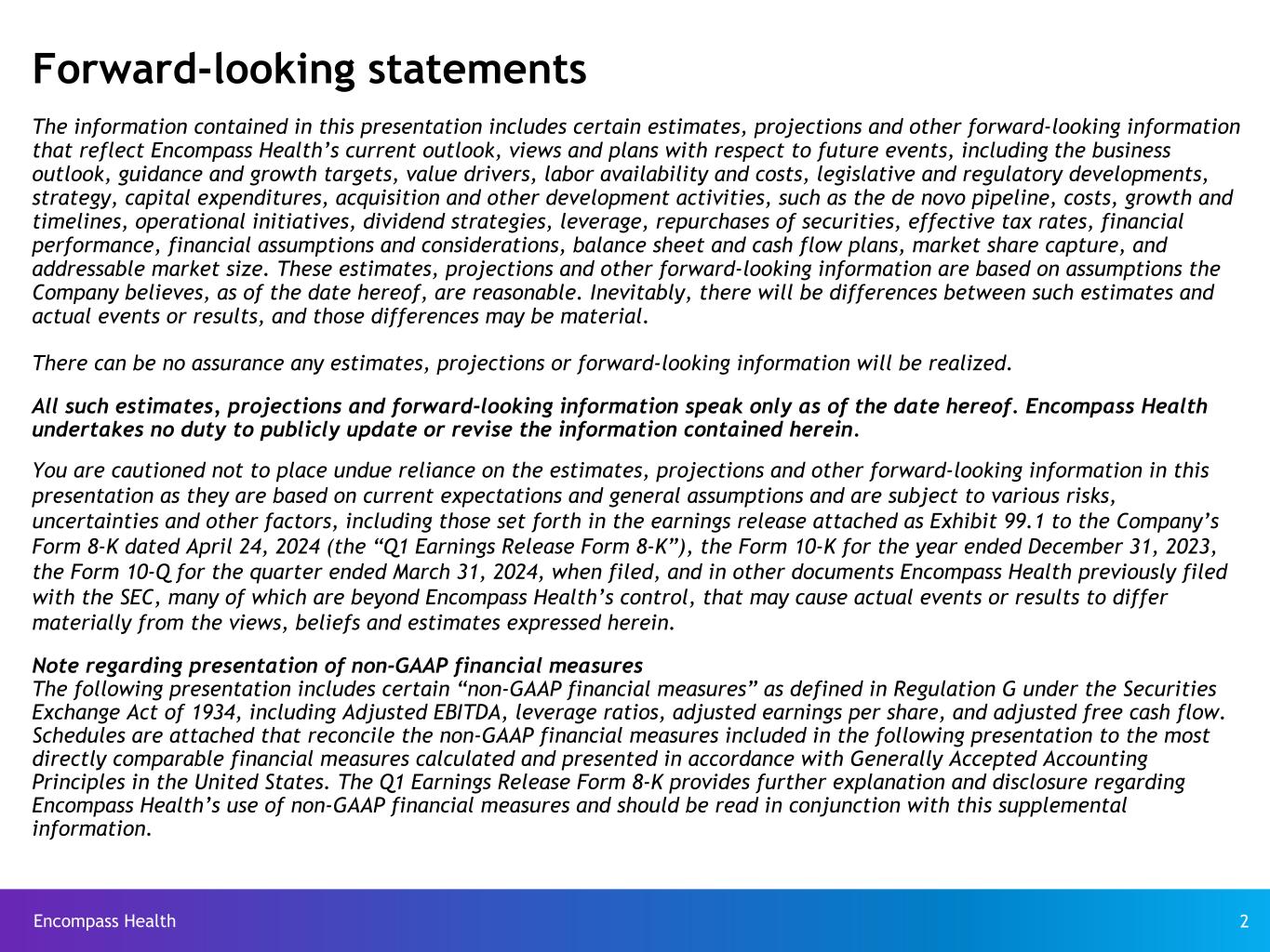 Encompass Health 2 The information contained in this presentation includes certain estimates, projections and other forward-looking information that reflect Encompass Health’s current outlook, views and plans with respect to future events, including the business outlook, guidance and growth targets, value drivers, labor availability and costs, legislative and regulatory developments, strategy, capital expenditures, acquisition and other development activities, such as the de novo pipeline, costs, growth and timelines, operational initiatives, dividend strategies, leverage, repurchases of securities, effective tax rates, financial performance, financial assumptions and considerations, balance sheet and cash flow plans, market share capture, and addressable market size. These estimates, projections and other forward-looking information are based on assumptions the Company believes, as of the date hereof, are reasonable. Inevitably, there will be differences between such estimates and actual events or results, and those differences may be material. There can be no assurance any estimates, projections or forward-looking information will be realized. All such estimates, projections and forward-looking information speak only as of the date hereof. Encompass Health undertakes no duty to publicly update or revise the information contained herein. You are cautioned not to place undue reliance on the estimates, projections and other forward-looking information in this presentation as they are based on current expectations and general assumptions and are subject to various risks, uncertainties and other factors, including those set forth in the earnings release attached as Exhibit 99.1 to the Company’s Form 8-K dated April 24, 2024 (the “Q1 Earnings Release Form 8-K”), the Form 10-K for the year ended December 31, 2023, the Form 10-Q for the quarter ended March 31, 2024, when filed, and in other documents Encompass Health previously filed with the SEC, many of which are beyond Encompass Health’s control, that may cause actual events or results to differ materially from the views, beliefs and estimates expressed herein. Note regarding presentation of non-GAAP financial measures The following presentation includes certain “non-GAAP financial measures” as defined in Regulation G under the Securities Exchange Act of 1934, including Adjusted EBITDA, leverage ratios, adjusted earnings per share, and adjusted free cash flow. Schedules are attached that reconcile the non-GAAP financial measures included in the following presentation to the most directly comparable financial measures calculated and presented in accordance with Generally Accepted Accounting Principles in the United States. The Q1 Earnings Release Form 8-K provides further explanation and disclosure regarding Encompass Health’s use of non-GAAP financial measures and should be read in conjunction with this supplemental information. Forward-looking statements