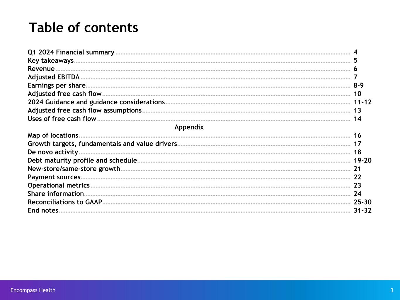 Encompass Health 3 Q1 2024 Financial summary ............................................................................................................................................. 4 Key takeaways ...................................................................................................................................................................... 5 Revenue ................................................................................................................................................................................. 6 Adjusted EBITDA .................................................................................................................................................................. 7 Earnings per share ............................................................................................................................................................... 8-9 Adjusted free cash flow ..................................................................................................................................................... 10 2024 Guidance and guidance considerations ............................................................................................................... 11-12 Adjusted free cash flow assumptions ............................................................................................................................. 13 Uses of free cash flow ........................................................................................................................................................ 14 Appendix Map of locations ................................................................................................................................................................... 16 Growth targets, fundamentals and value drivers ........................................................................................................ 17 De novo activity ................................................................................................................................................................... 18 Debt maturity profile and schedule ................................................................................................................................ 19-20 New-store/same-store growth .......................................................................................................................................... 21 Payment sources .................................................................................................................................................................. 22 Operational metrics ............................................................................................................................................................ 23 Share information ................................................................................................................................................................ 24 Reconciliations to GAAP ..................................................................................................................................................... 25-30 End notes ............................................................................................................................................................................... 31-32 Table of contents