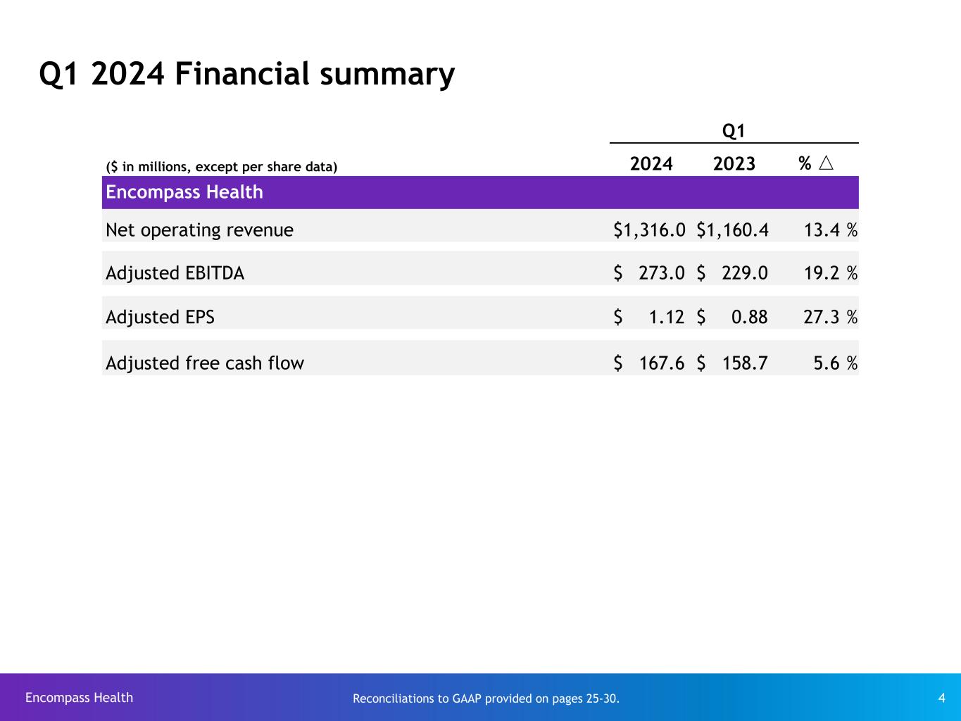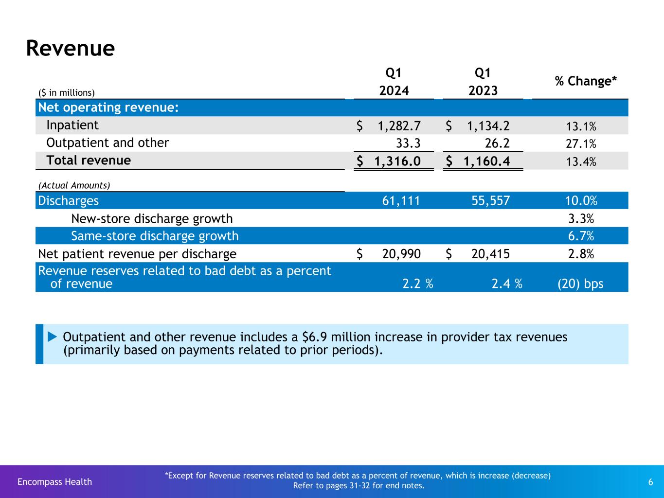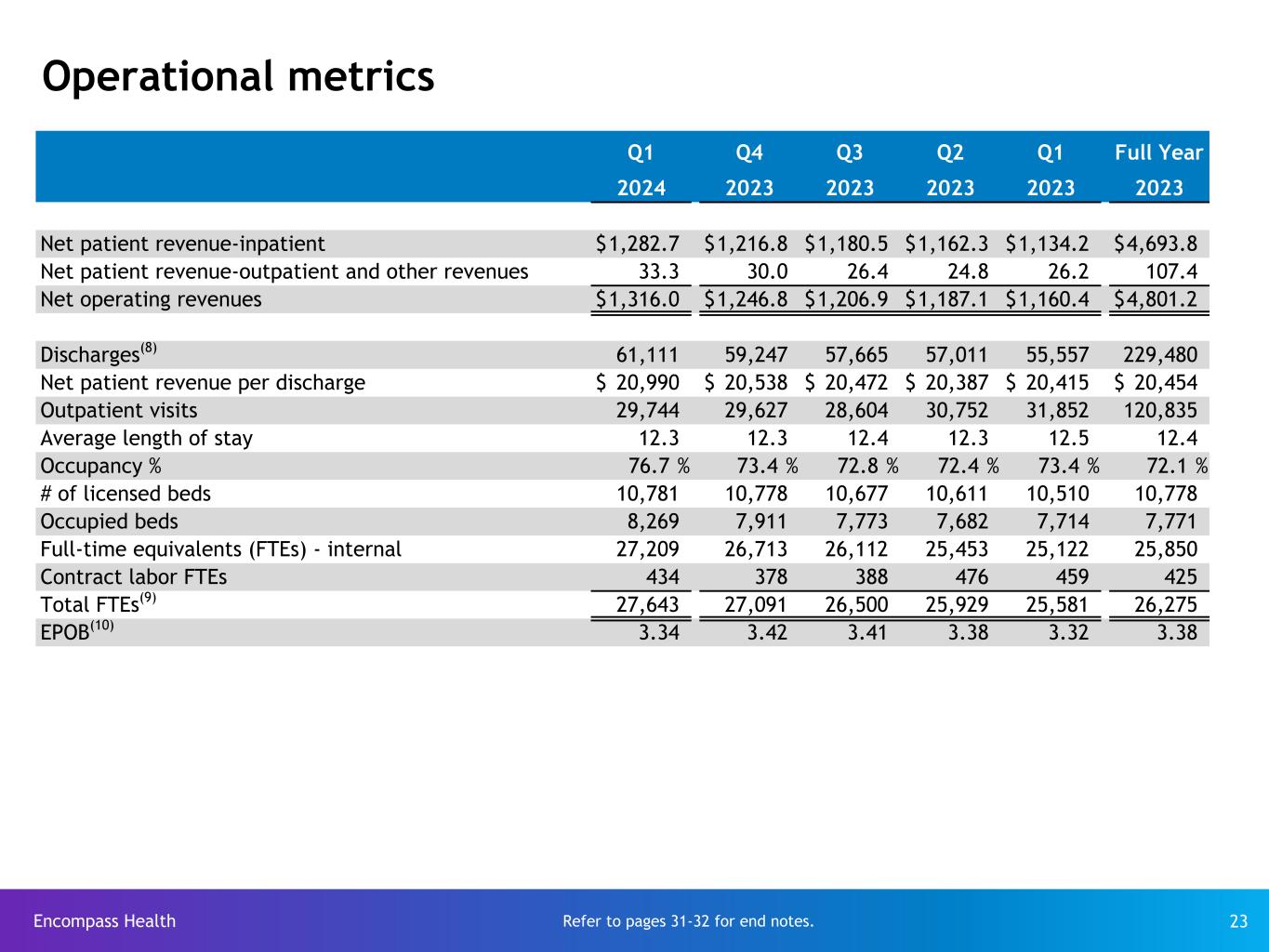 Encompass Health 23 Operational metrics Q1 Q4 Q3 Q2 Q1 Full Year 2024 2023 2023 2023 2023 2023 Net patient revenue-inpatient $ 1,282.7 $ 1,216.8 $ 1,180.5 $ 1,162.3 $ 1,134.2 $ 4,693.8 Net patient revenue-outpatient and other revenues 33.3 30.0 26.4 24.8 26.2 107.4 Net operating revenues $ 1,316.0 $ 1,246.8 $ 1,206.9 $ 1,187.1 $ 1,160.4 $ 4,801.2 Discharges(8) 61,111 59,247 57,665 57,011 55,557 229,480 Net patient revenue per discharge $ 20,990 $ 20,538 $ 20,472 $ 20,387 $ 20,415 $ 20,454 Outpatient visits 29,744 29,627 28,604 30,752 31,852 120,835 Average length of stay 12.3 12.3 12.4 12.3 12.5 12.4 Occupancy % 76.7 % 73.4 % 72.8 % 72.4 % 73.4 % 72.1 % # of licensed beds 10,781 10,778 10,677 10,611 10,510 10,778 Occupied beds 8,269 7,911 7,773 7,682 7,714 7,771 Full-time equivalents (FTEs) - internal 27,209 26,713 26,112 25,453 25,122 25,850 Contract labor FTEs 434 378 388 476 459 425 Total FTEs(9) 27,643 27,091 26,500 25,929 25,581 26,275 EPOB(10) 3.34 3.42 3.41 3.38 3.32 3.38 Refer to pages 31-32 for end notes.
