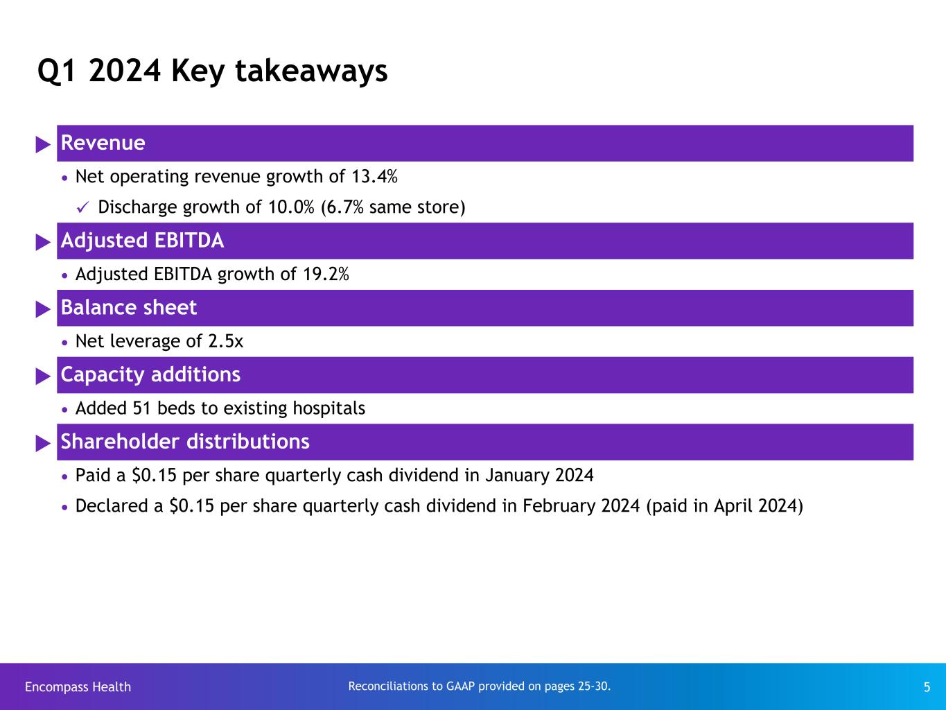 Encompass Health 4 Q1 2024 Financial summary Q1 ($ in millions, except per share data) 2024 2023 % △ Encompass Health Net operating revenue $ 1,316.0 $ 1,160.4 13.4 % Adjusted EBITDA $ 273.0 $ 229.0 19.2 % Adjusted EPS $ 1.12 $ 0.88 27.3 % Adjusted free cash flow $ 167.6 $ 158.7 5.6 % Reconciliations to GAAP provided on pages 25-30.