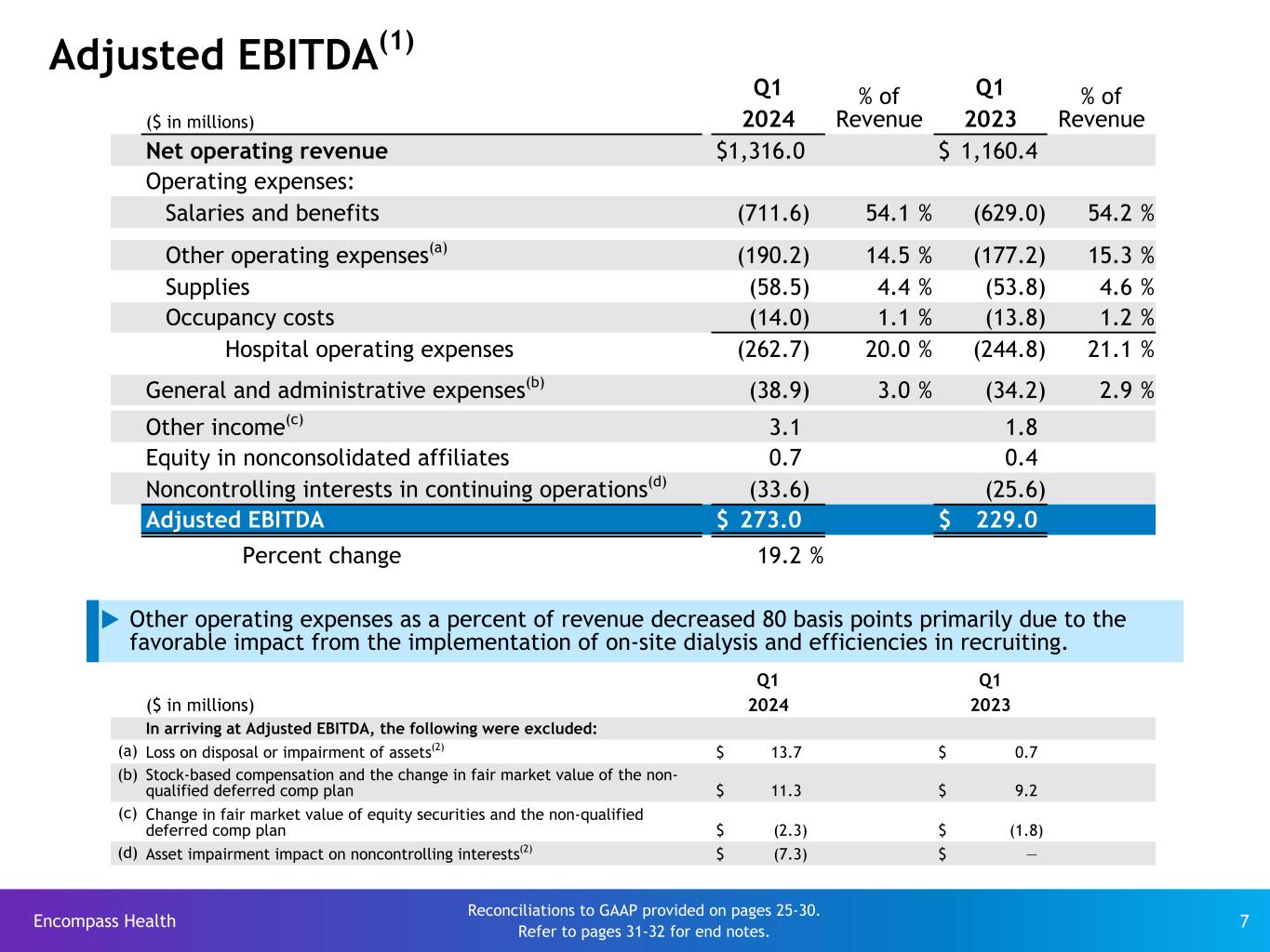 Encompass Health 6 Revenue Q1 Q1 % Change* ($ in millions) 2024 2023 Net operating revenue: Inpatient $ 1,282.7 $ 1,134.2 13.1% Outpatient and other 33.3 26.2 27.1% Total revenue $ 1,316.0 $ 1,160.4 13.4% (Actual Amounts) Discharges 61,111 55,557 10.0% New-store discharge growth 3.3% Same-store discharge growth 6.7% Net patient revenue per discharge $ 20,990 $ 20,415 2.8% Revenue reserves related to bad debt as a percent of revenue 2.2 % 2.4 % (20) bps u Outpatient and other revenue includes a $6.9 million increase in provider tax revenues (primarily based on payments related to prior periods). *Except for Revenue reserves related to bad debt as a percent of revenue, which is increase (decrease) Refer to pages 31-32 for end notes.