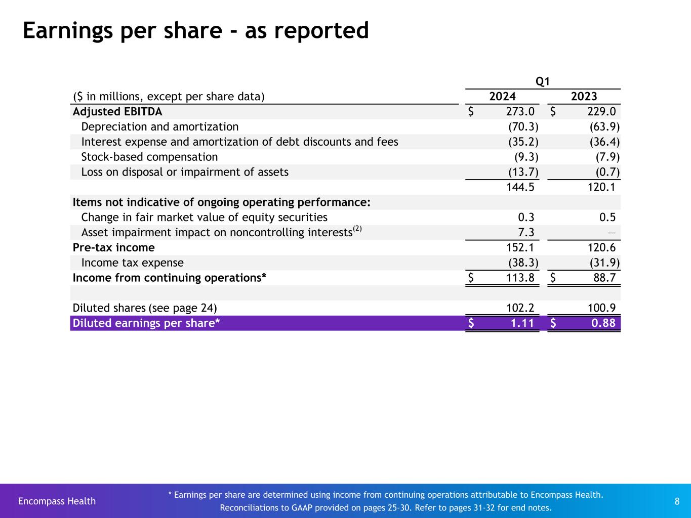 Encompass Health 7 Adjusted EBITDA(1) Q1 % of Revenue Q1 % of Revenue($ in millions) 2024 2023 Net operating revenue $ 1,316.0 $ 1,160.4 Operating expenses: Salaries and benefits (711.6) 54.1 % (629.0) 54.2 % Other operating expenses(a) (190.2) 14.5 % (177.2) 15.3 % Supplies (58.5) 4.4 % (53.8) 4.6 % Occupancy costs (14.0) 1.1 % (13.8) 1.2 % Hospital operating expenses (262.7) 20.0 % (244.8) 21.1 % General and administrative expenses(b) (38.9) 3.0 % (34.2) 2.9 % Other income(c) 3.1 1.8 Equity in nonconsolidated affiliates 0.7 0.4 Noncontrolling interests in continuing operations(d) (33.6) (25.6) Adjusted EBITDA $ 273.0 $ 229.0 Percent change 19.2 % Q1 Q1 ($ in millions) 2024 2023 In arriving at Adjusted EBITDA, the following were excluded: (a) Loss on disposal or impairment of assets(2) $ 13.7 $ 0.7 (b) Stock-based compensation and the change in fair market value of the non- qualified deferred comp plan $ 11.3 $ 9.2 (c) Change in fair market value of equity securities and the non-qualified deferred comp plan $ (2.3) $ (1.8) (d) Asset impairment impact on noncontrolling interests(2) $ (7.3) $ — u Other operating expenses as a percent of revenue decreased 80 basis points primarily due to the favorable impact from the implementation of on-site dialysis and efficiencies in recruiting. Reconciliations to GAAP provided on pages 25-30. Refer to pages 31-32 for end notes.