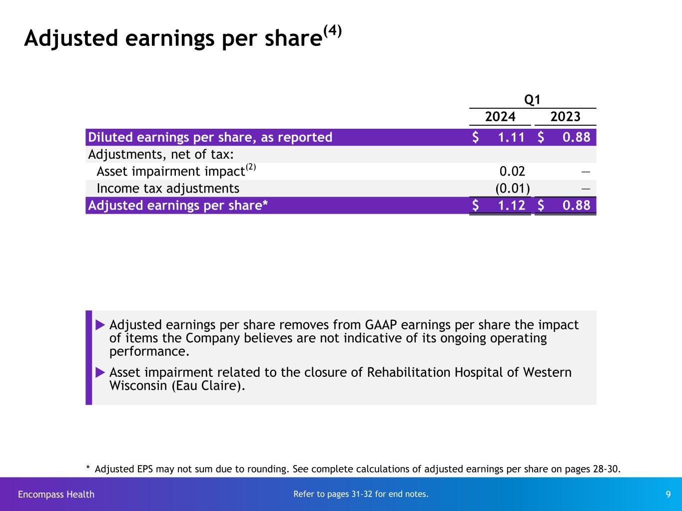 Encompass Health 8 Earnings per share - as reported Q1 ($ in millions, except per share data) 2024 2023 Adjusted EBITDA $ 273.0 $ 229.0 Depreciation and amortization (70.3) (63.9) Interest expense and amortization of debt discounts and fees (35.2) (36.4) Stock-based compensation (9.3) (7.9) Loss on disposal or impairment of assets (13.7) (0.7) 144.5 120.1 Items not indicative of ongoing operating performance: Change in fair market value of equity securities 0.3 0.5 Asset impairment impact on noncontrolling interests(2) 7.3 — Pre-tax income 152.1 120.6 Income tax expense (38.3) (31.9) Income from continuing operations* $ 113.8 $ 88.7 Diluted shares (see page 24) 102.2 100.9 Diluted earnings per share* $ 1.11 $ 0.88 * Earnings per share are determined using income from continuing operations attributable to Encompass Health. Reconciliations to GAAP provided on pages 25-30. Refer to pages 31-32 for end notes.