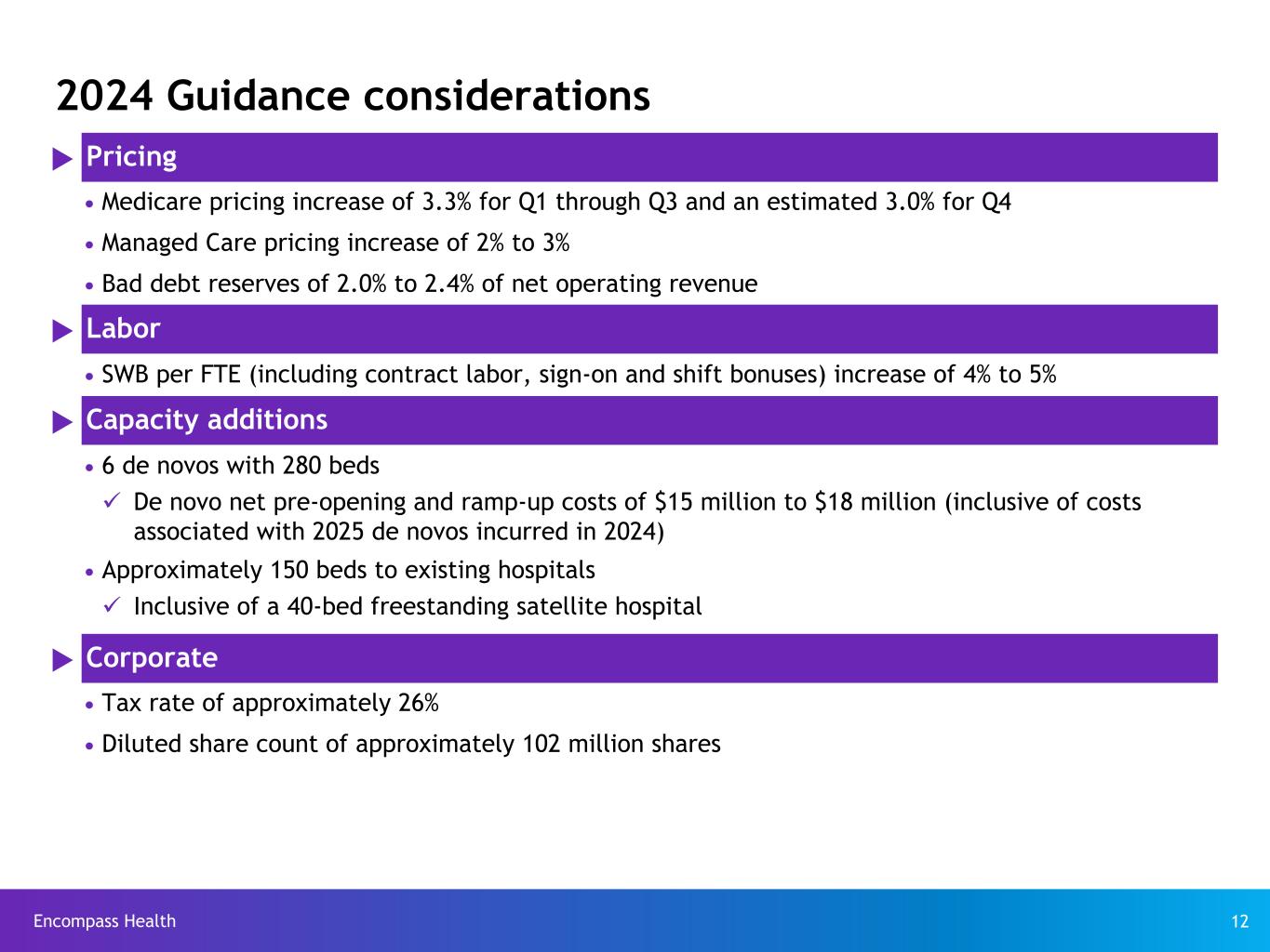 Encompass Health 12 2024 Guidance considerations u Pricing Ÿ Medicare pricing increase of 3.3% for Q1 through Q3 and an estimated 3.0% for Q4 Ÿ Managed Care pricing increase of 2% to 3% Ÿ Bad debt reserves of 2.0% to 2.4% of net operating revenue u Labor Ÿ SWB per FTE (including contract labor, sign-on and shift bonuses) increase of 4% to 5% u Capacity additions Ÿ 6 de novos with 280 beds ü De novo net pre-opening and ramp-up costs of $15 million to $18 million (inclusive of costs associated with 2025 de novos incurred in 2024) Ÿ Approximately 150 beds to existing hospitals ü Inclusive of a 40-bed freestanding satellite hospital u Corporate Ÿ Tax rate of approximately 26% Ÿ Diluted share count of approximately 102 million shares