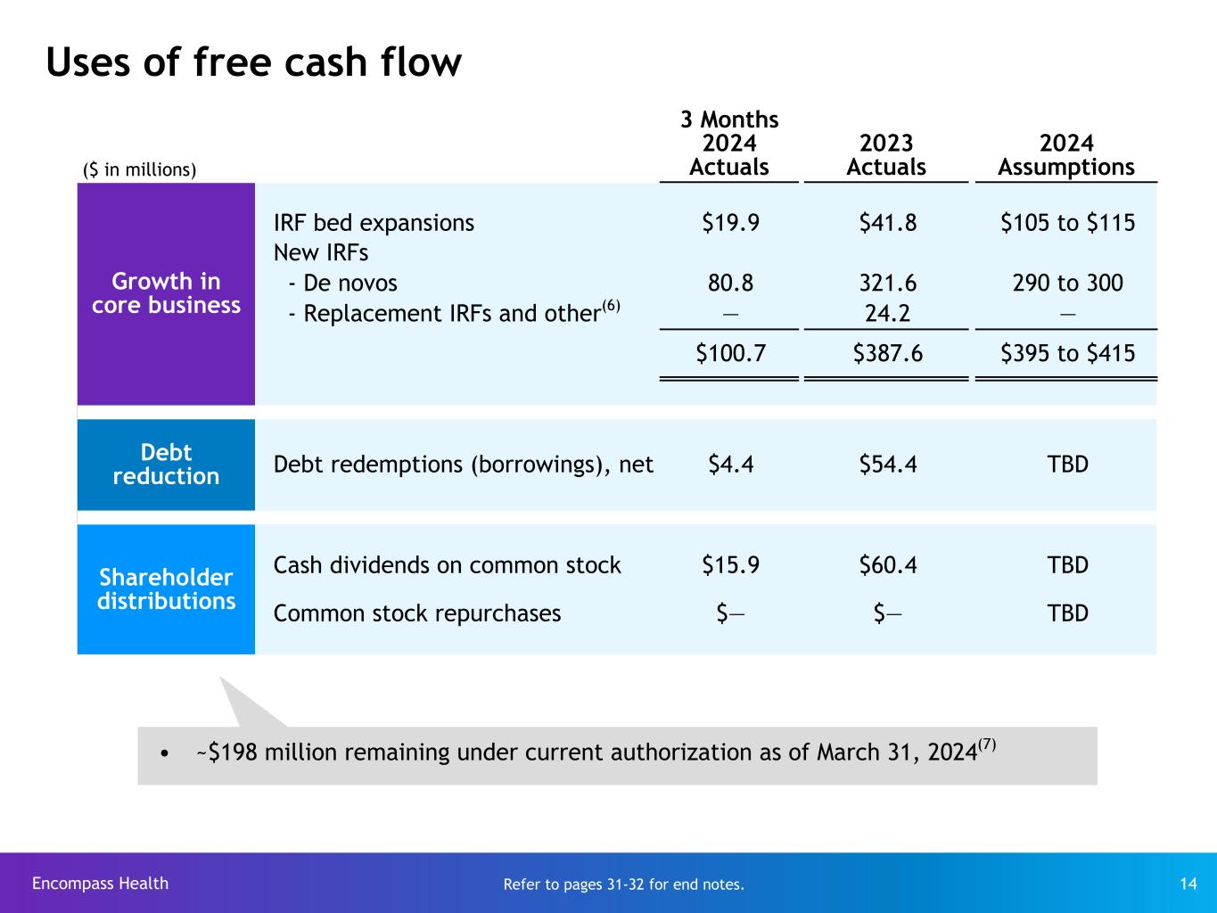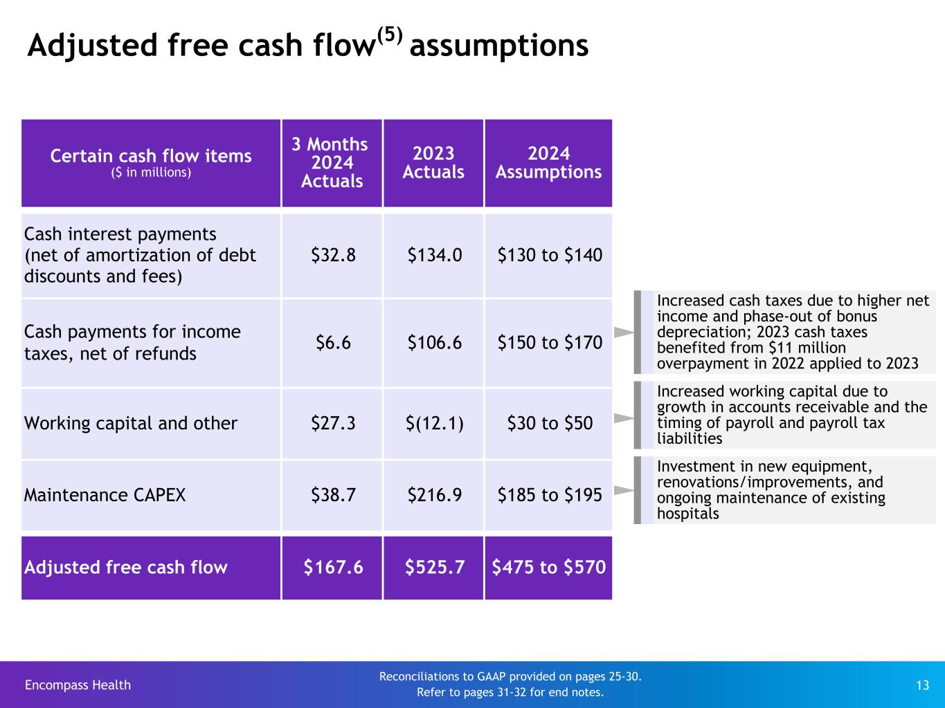 Encompass Health 13 Adjusted free cash flow(5) assumptions Certain cash flow items ($ in millions) 3 Months  2024 Actuals 2023 Actuals 2024 Assumptions Cash interest payments (net of amortization of debt discounts and fees) $32.8 $134.0 $130 to $140 Cash payments for income taxes, net of refunds $6.6 $106.6 $150 to $170 Working capital and other $27.3 $(12.1) $30 to $50 Maintenance CAPEX $38.7 $216.9 $185 to $195 Adjusted free cash flow $167.6 $525.7 $475 to $570 Increased cash taxes due to higher net income and phase-out of bonus depreciation; 2023 cash taxes benefited from $11 million overpayment in 2022 applied to 2023 Increased working capital due to growth in accounts receivable and the timing of payroll and payroll tax liabilities Investment in new equipment, renovations/improvements, and ongoing maintenance of existing hospitals Reconciliations to GAAP provided on pages 25-30. Refer to pages 31-32 for end notes.