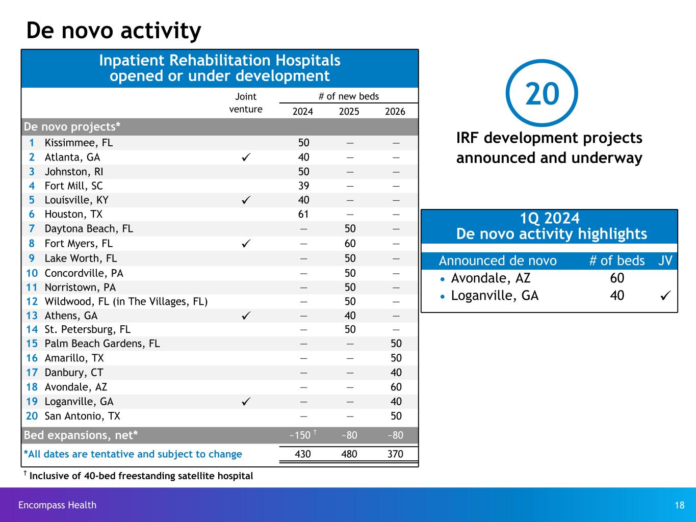 Encompass Health 18 Inpatient Rehabilitation Hospitals opened or under development Joint venture # of new beds 2024 2025 2026 De novo projects* 1 Kissimmee, FL 50 — — 2 Atlanta, GA ü 40 — — 3 Johnston, RI 50 — — 4 Fort Mill, SC 39 — — 5 Louisville, KY ü 40 — — 6 Houston, TX 61 — — 7 Daytona Beach, FL — 50 — 8 Fort Myers, FL ü — 60 — 9 Lake Worth, FL — 50 — 10 Concordville, PA — 50 — 11 Norristown, PA — 50 — 12 Wildwood, FL (in The Villages, FL) — 50 — 13 Athens, GA ü — 40 — 14 St. Petersburg, FL — 50 — 15 Palm Beach Gardens, FL — — 50 16 Amarillo, TX — — 50 17 Danbury, CT — — 40 18 Avondale, AZ — — 60 19 Loganville, GA ü — — 40 20 San Antonio, TX — — 50 Bed expansions, net* ~150 † ~80 ~80 *All dates are tentative and subject to change 430 480 370 † Inclusive of 40-bed freestanding satellite hospital De novo activity 1Q 2024 De novo activity highlights u Announced de novo # of beds JV Ÿ Avondale, AZ 60 Ÿ Loganville, GA 40 ü IRF development projects announced and underway 20
