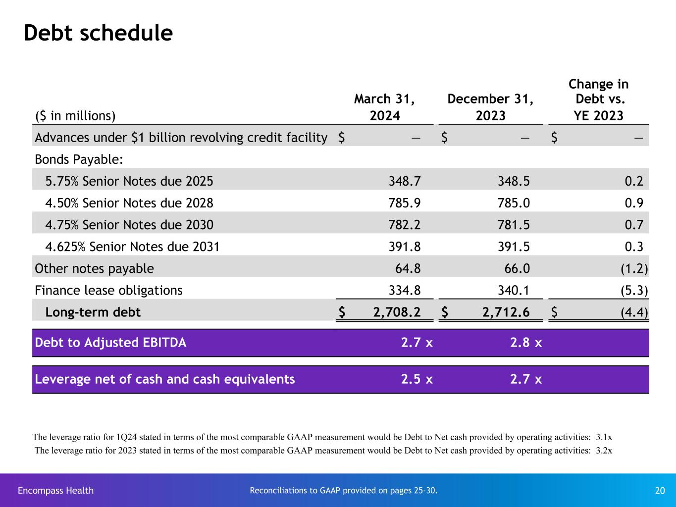 Encompass Health 19 2023 2024 2025 2026 2027 2028 2029 2030 2031 * This chart does not include ~$335 of finance lease obligations or ~$65 of other notes payable. See the debt schedule on page 20. Debt maturity profile - face value $350 Senior Notes 5.75% ($ in millions) Revolver capacity $800 Senior Notes 4.75% $800 Senior Notes 4.5% Revolver As of March 31, 2024* $964 Available $— Drawn + $36 reserved for LCs Callable at par Callable beginning February 2025Callable at 101.125 $400 Senior Notes 4.625% Callable beginning April 2026