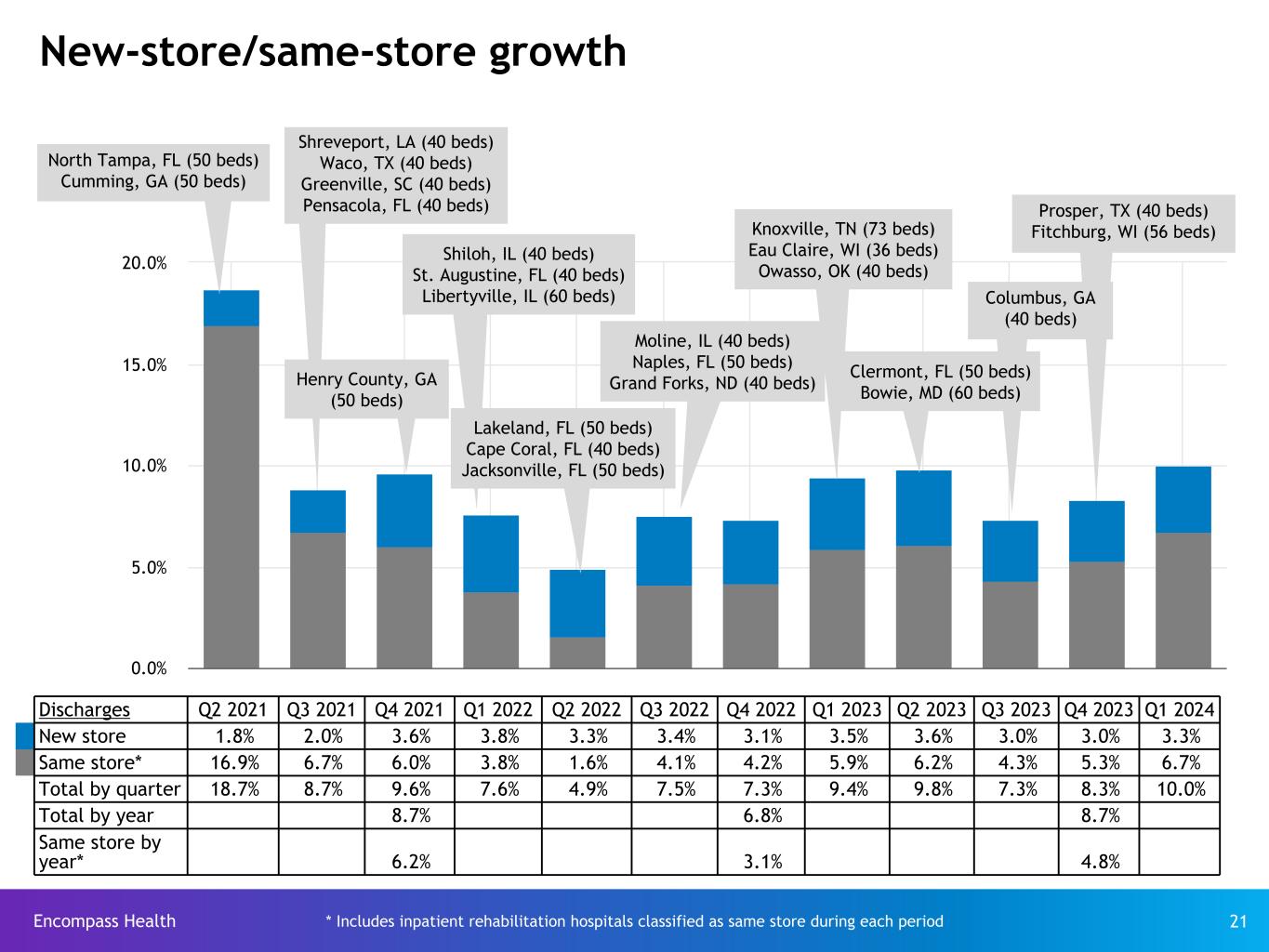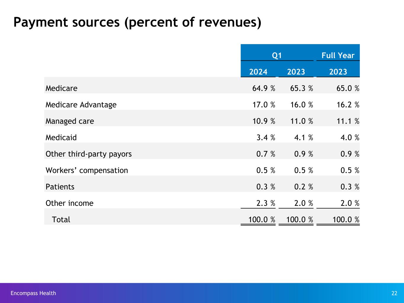 Encompass Health 21 0.0% 5.0% 10.0% 15.0% 20.0% * Includes inpatient rehabilitation hospitals classified as same store during each period New-store/same-store growth North Tampa, FL (50 beds) Cumming, GA (50 beds) Shreveport, LA (40 beds) Waco, TX (40 beds) Greenville, SC (40 beds) Pensacola, FL (40 beds) Discharges Q2 2021 Q3 2021 Q4 2021 Q1 2022 Q2 2022 Q3 2022 Q4 2022 Q1 2023 Q2 2023 Q3 2023 Q4 2023 Q1 2024 New store 1.8% 2.0% 3.6% 3.8% 3.3% 3.4% 3.1% 3.5% 3.6% 3.0% 3.0% 3.3% Same store* 16.9% 6.7% 6.0% 3.8% 1.6% 4.1% 4.2% 5.9% 6.2% 4.3% 5.3% 6.7% Total by quarter 18.7% 8.7% 9.6% 7.6% 4.9% 7.5% 7.3% 9.4% 9.8% 7.3% 8.3% 10.0% Total by year 8.7% 6.8% 8.7% Same store by year* 6.2% 3.1% 4.8% Shiloh, IL (40 beds) St. Augustine, FL (40 beds) Libertyville, IL (60 beds) Henry County, GA (50 beds) Moline, IL (40 beds) Naples, FL (50 beds) Grand Forks, ND (40 beds) Lakeland, FL (50 beds) Cape Coral, FL (40 beds) Jacksonville, FL (50 beds) Knoxville, TN (73 beds) Eau Claire, WI (36 beds) Owasso, OK (40 beds) Clermont, FL (50 beds) Bowie, MD (60 beds) Columbus, GA (40 beds) Prosper, TX (40 beds) Fitchburg, WI (56 beds)