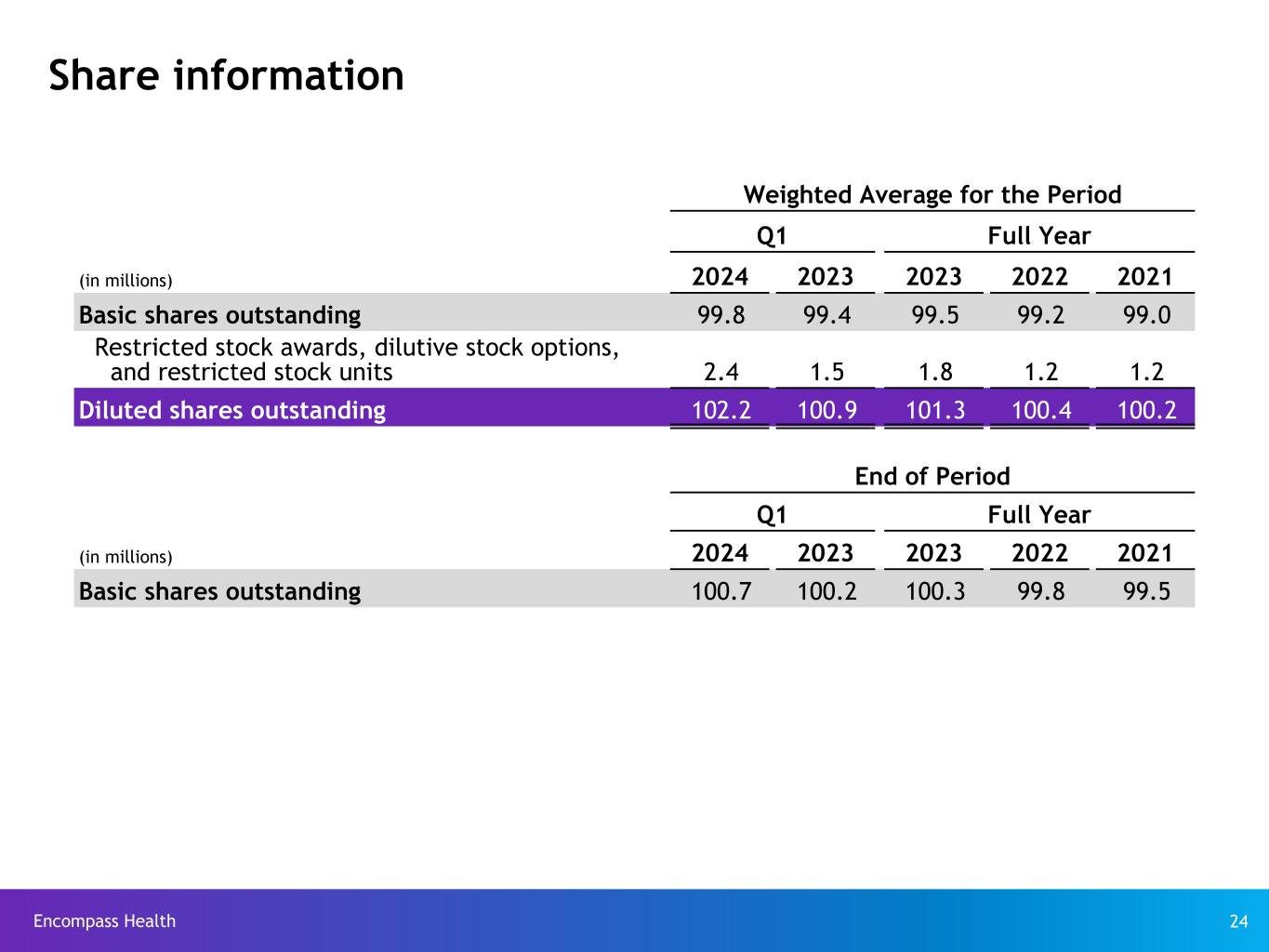 Encompass Health 24 Share information Weighted Average for the Period Q1 Full Year (in millions) 2024 2023 2023 2022 2021 Basic shares outstanding 99.8 99.4 99.5 99.2 99.0 Restricted stock awards, dilutive stock options, and restricted stock units 2.4 1.5 1.8 1.2 1.2 Diluted shares outstanding 102.2 100.9 101.3 100.4 100.2 End of Period Q1 Full Year (in millions) 2024 2023 2023 2022 2021 Basic shares outstanding 100.7 100.2 100.3 99.8 99.5