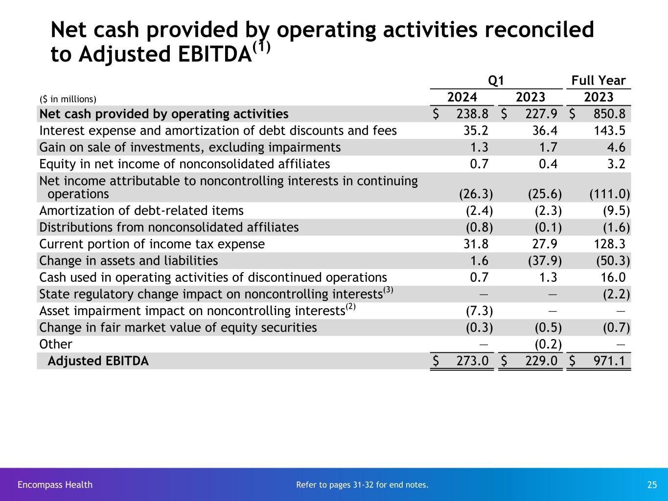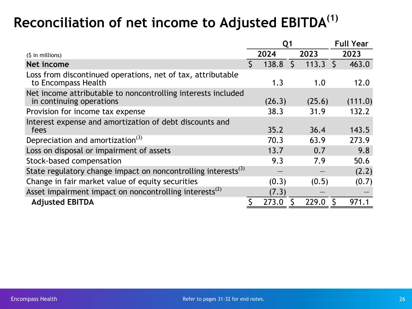 Encompass Health 25 Net cash provided by operating activities reconciled to Adjusted EBITDA(1) Q1 Full Year ($ in millions) 2024 2023 2023 Net cash provided by operating activities $ 238.8 $ 227.9 $ 850.8 Interest expense and amortization of debt discounts and fees 35.2 36.4 143.5 Gain on sale of investments, excluding impairments 1.3 1.7 4.6 Equity in net income of nonconsolidated affiliates 0.7 0.4 3.2 Net income attributable to noncontrolling interests in continuing operations (26.3) (25.6) (111.0) Amortization of debt-related items (2.4) (2.3) (9.5) Distributions from nonconsolidated affiliates (0.8) (0.1) (1.6) Current portion of income tax expense 31.8 27.9 128.3 Change in assets and liabilities 1.6 (37.9) (50.3) Cash used in operating activities of discontinued operations 0.7 1.3 16.0 State regulatory change impact on noncontrolling interests(3) — — (2.2) Asset impairment impact on noncontrolling interests(2) (7.3) — — Change in fair market value of equity securities (0.3) (0.5) (0.7) Other — (0.2) — Adjusted EBITDA $ 273.0 $ 229.0 $ 971.1 Refer to pages 31-32 for end notes.