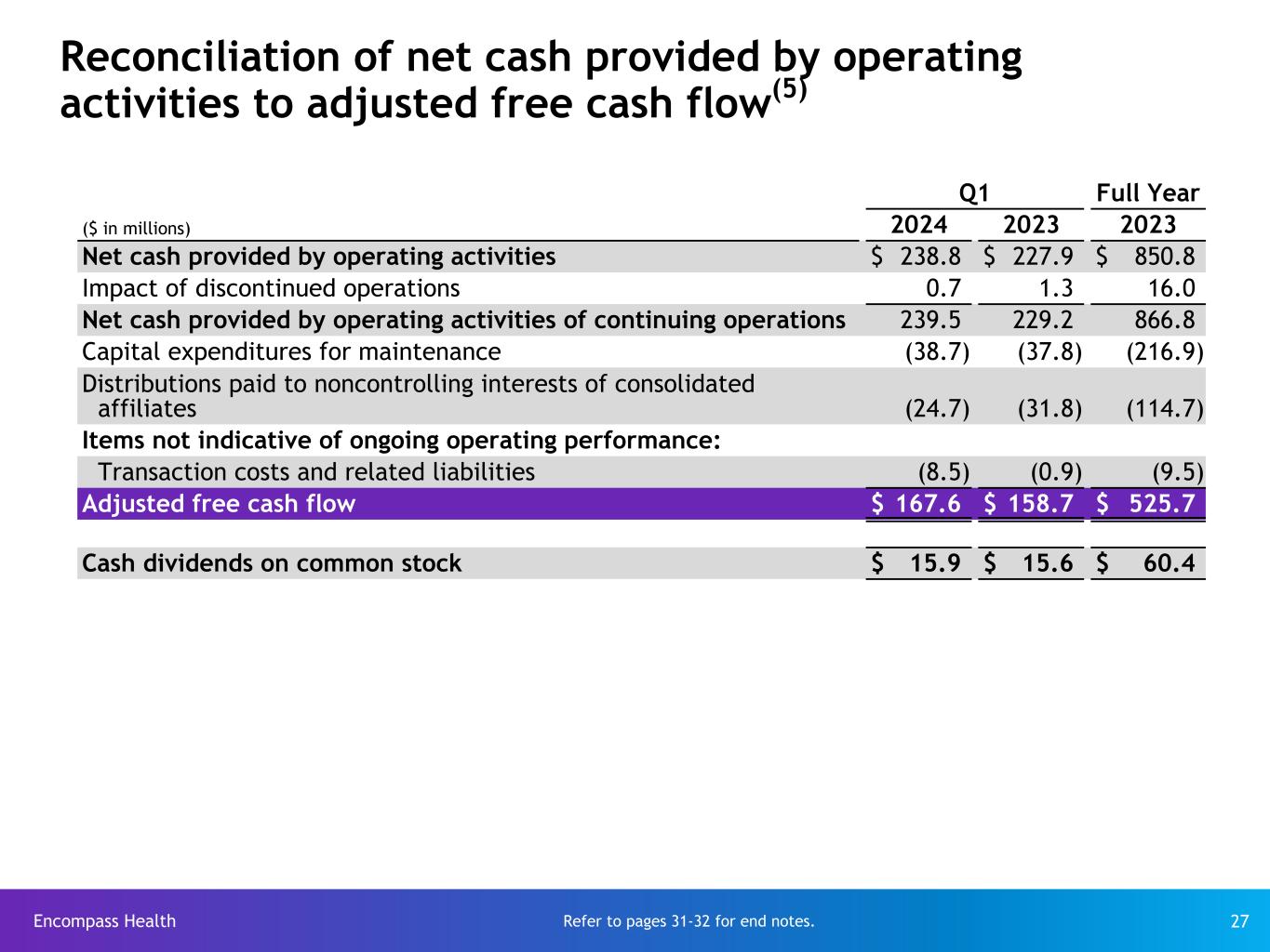 Encompass Health 27 Reconciliation of net cash provided by operating activities to adjusted free cash flow(5) Q1 Full Year ($ in millions) 2024 2023 2023 Net cash provided by operating activities $ 238.8 $ 227.9 $ 850.8 Impact of discontinued operations 0.7 1.3 16.0 Net cash provided by operating activities of continuing operations 239.5 229.2 866.8 Capital expenditures for maintenance (38.7) (37.8) (216.9) Distributions paid to noncontrolling interests of consolidated affiliates (24.7) (31.8) (114.7) Items not indicative of ongoing operating performance: Transaction costs and related liabilities (8.5) (0.9) (9.5) Adjusted free cash flow $ 167.6 $ 158.7 $ 525.7 Cash dividends on common stock $ 15.9 $ 15.6 $ 60.4 Refer to pages 31-32 for end notes.