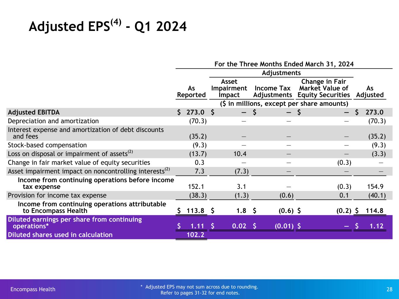 Encompass Health 30 Adjusted EPS(4) - 2023 For the Year Ended December 31, 2023 Adjustments As Reported State Regulatory Change Impact Income Tax Adjustments Change in Fair Market Value of Equity Securities As Adjusted ($ in millions, except per share amounts) Adjusted EBITDA $ 971.1 $ — $ — $ — $ 971.1 Depreciation and amortization(3) (273.9) 6.1 — — (267.8) Interest expense and amortization of debt discounts and fees (143.5) — — — (143.5) Stock-based compensation (50.6) — — — (50.6) Loss on disposal or impairment of assets (9.8) — — — (9.8) State regulatory change impact on noncontrolling interests(3) 2.2 (2.2) — — — Change in fair market value of equity securities 0.7 — — (0.7) — Income from continuing operations before income tax expense 496.2 3.9 — (0.7) 499.4 Provision for income tax expense (132.2) (1.0) 2.8 0.2 (130.2) Income from continuing operations attributable to Encompass Health $ 364.0 $ 2.9 $ 2.8 $ (0.5) $ 369.2 Diluted earnings per share from continuing operations* $ 3.59 $ 0.03 $ 0.03 $ — $ 3.64 Diluted shares used in calculation 101.3 * Adjusted EPS may not sum across due to rounding. Refer to pages 31-32 for end notes.