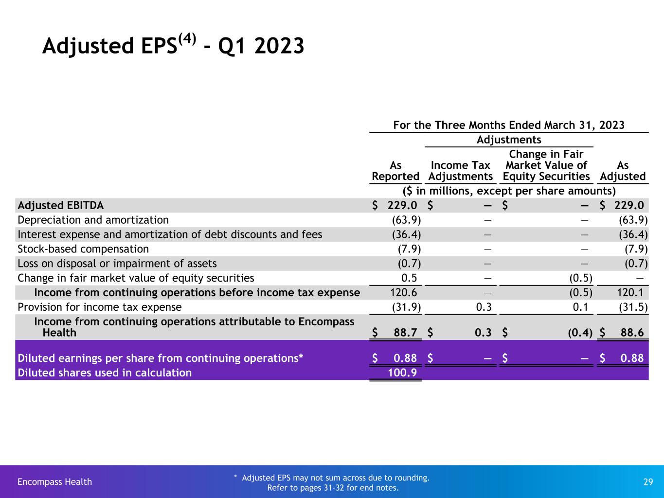 Encompass Health 28 Adjusted EPS(4) - Q1 2024 For the Three Months Ended March 31, 2024 Adjustments As Reported Asset Impairment Impact Income Tax Adjustments Change in Fair Market Value of Equity Securities As Adjusted ($ in millions, except per share amounts) Adjusted EBITDA $ 273.0 $ — $ — $ — $ 273.0 Depreciation and amortization (70.3) — — — (70.3) Interest expense and amortization of debt discounts and fees (35.2) — — — (35.2) Stock-based compensation (9.3) — — — (9.3) Loss on disposal or impairment of assets(2) (13.7) 10.4 — — (3.3) Change in fair market value of equity securities 0.3 — — (0.3) — Asset impairment impact on noncontrolling interests(2) 7.3 (7.3) — — — Income from continuing operations before income tax expense 152.1 3.1 — (0.3) 154.9 Provision for income tax expense (38.3) (1.3) (0.6) 0.1 (40.1) Income from continuing operations attributable to Encompass Health $ 113.8 $ 1.8 $ (0.6) $ (0.2) $ 114.8 Diluted earnings per share from continuing operations* $ 1.11 $ 0.02 $ (0.01) $ — $ 1.12 Diluted shares used in calculation 102.2 * Adjusted EPS may not sum across due to rounding. Refer to pages 31-32 for end notes.