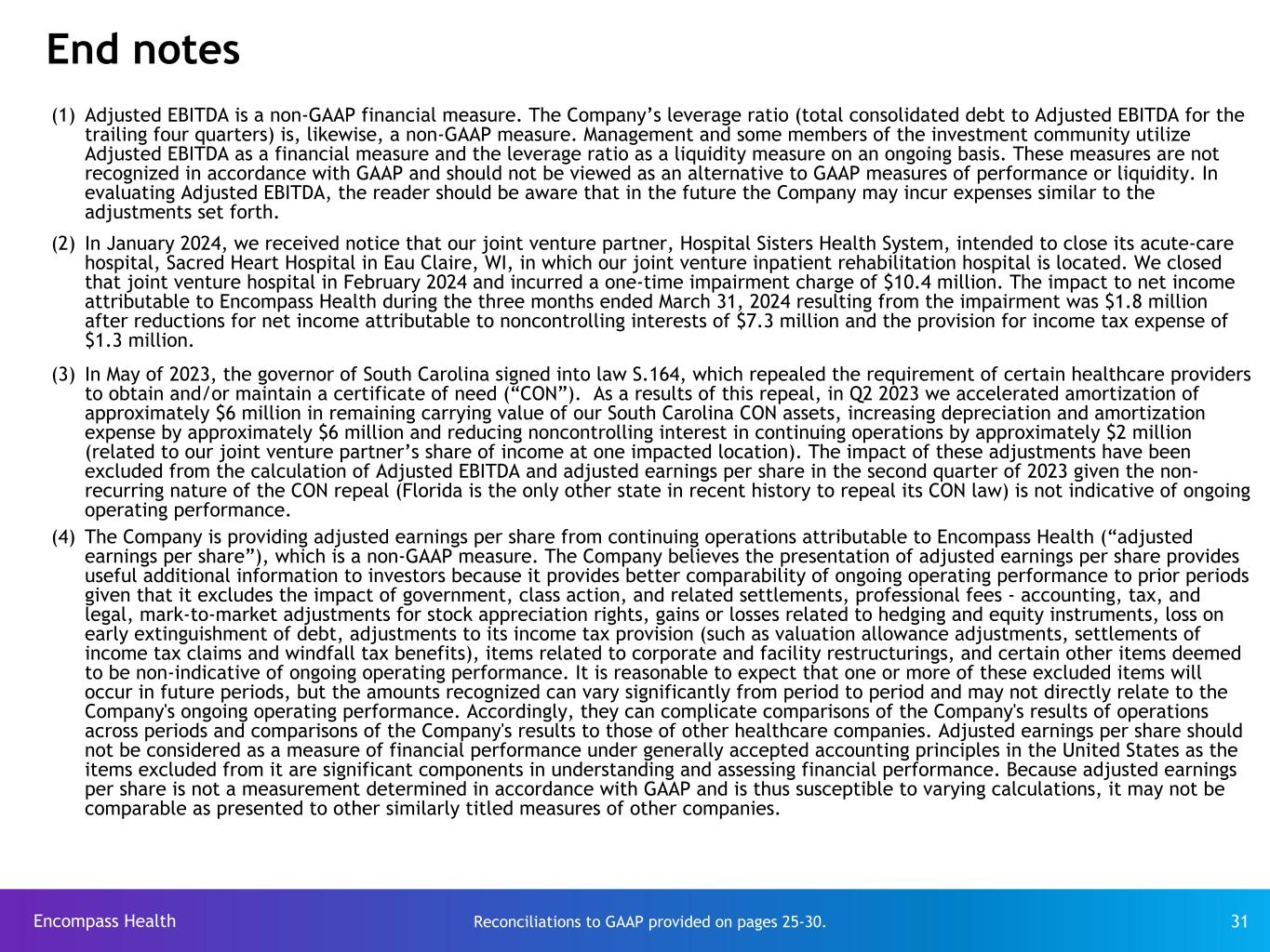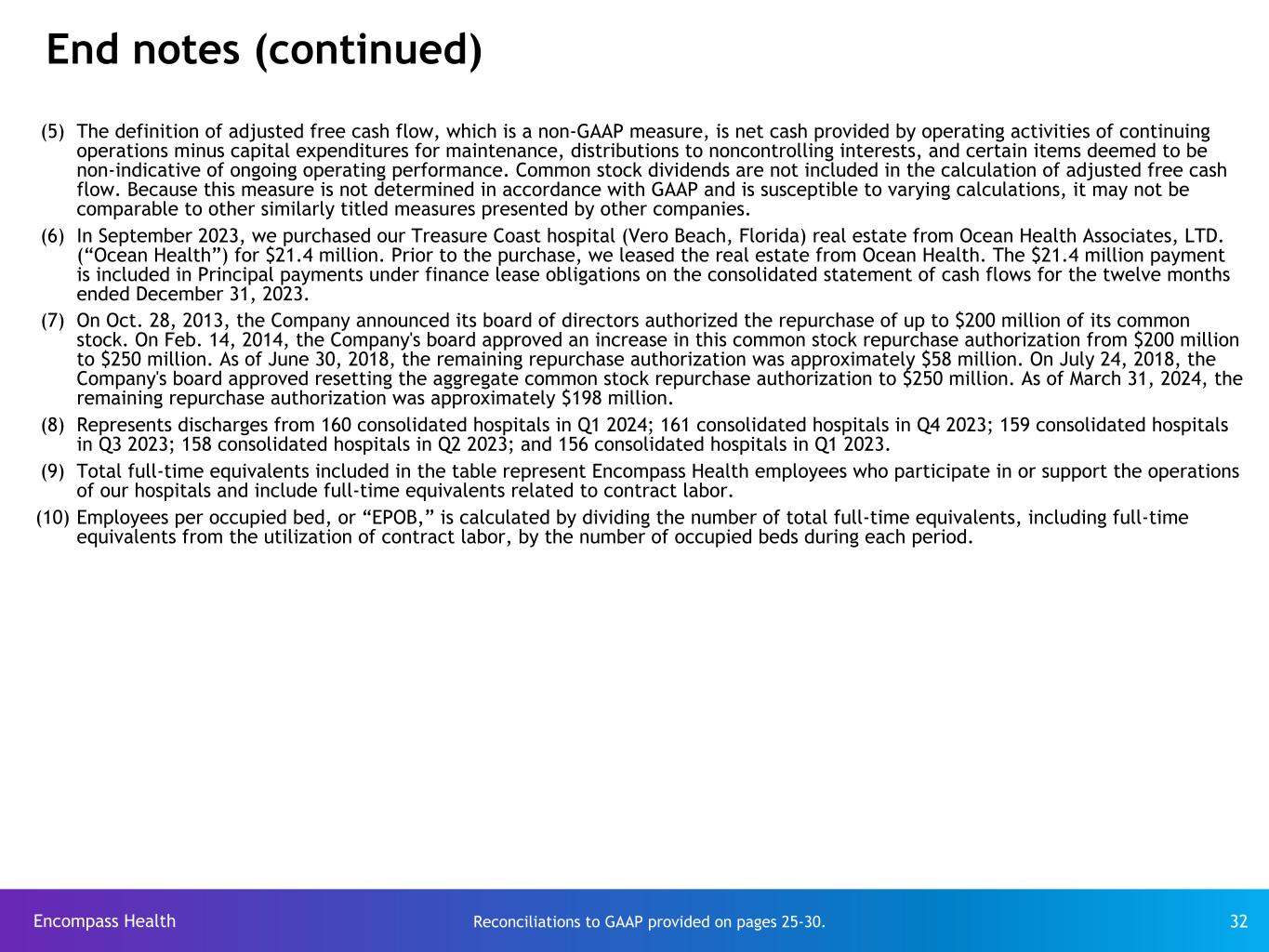 Encompass Health 31 End notes Reconciliations to GAAP provided on pages 25-30. (1) Adjusted EBITDA is a non-GAAP financial measure. The Company’s leverage ratio (total consolidated debt to Adjusted EBITDA for the trailing four quarters) is, likewise, a non-GAAP measure. Management and some members of the investment community utilize Adjusted EBITDA as a financial measure and the leverage ratio as a liquidity measure on an ongoing basis. These measures are not recognized in accordance with GAAP and should not be viewed as an alternative to GAAP measures of performance or liquidity. In evaluating Adjusted EBITDA, the reader should be aware that in the future the Company may incur expenses similar to the adjustments set forth. (2) In January 2024, we received notice that our joint venture partner, Hospital Sisters Health System, intended to close its acute-care hospital, Sacred Heart Hospital in Eau Claire, WI, in which our joint venture inpatient rehabilitation hospital is located. We closed that joint venture hospital in February 2024 and incurred a one-time impairment charge of $10.4 million. The impact to net income attributable to Encompass Health during the three months ended March 31, 2024 resulting from the impairment was $1.8 million after reductions for net income attributable to noncontrolling interests of $7.3 million and the provision for income tax expense of $1.3 million. (3) In May of 2023, the governor of South Carolina signed into law S.164, which repealed the requirement of certain healthcare providers to obtain and/or maintain a certificate of need (“CON”). As a results of this repeal, in Q2 2023 we accelerated amortization of approximately $6 million in remaining carrying value of our South Carolina CON assets, increasing depreciation and amortization expense by approximately $6 million and reducing noncontrolling interest in continuing operations by approximately $2 million (related to our joint venture partner’s share of income at one impacted location). The impact of these adjustments have been excluded from the calculation of Adjusted EBITDA and adjusted earnings per share in the second quarter of 2023 given the non- recurring nature of the CON repeal (Florida is the only other state in recent history to repeal its CON law) is not indicative of ongoing operating performance. (4) The Company is providing adjusted earnings per share from continuing operations attributable to Encompass Health (“adjusted earnings per share”), which is a non-GAAP measure. The Company believes the presentation of adjusted earnings per share provides useful additional information to investors because it provides better comparability of ongoing operating performance to prior periods given that it excludes the impact of government, class action, and related settlements, professional fees - accounting, tax, and legal, mark-to-market adjustments for stock appreciation rights, gains or losses related to hedging and equity instruments, loss on early extinguishment of debt, adjustments to its income tax provision (such as valuation allowance adjustments, settlements of income tax claims and windfall tax benefits), items related to corporate and facility restructurings, and certain other items deemed to be non-indicative of ongoing operating performance. It is reasonable to expect that one or more of these excluded items will occur in future periods, but the amounts recognized can vary significantly from period to period and may not directly relate to the Company's ongoing operating performance. Accordingly, they can complicate comparisons of the Company's results of operations across periods and comparisons of the Company's results to those of other healthcare companies. Adjusted earnings per share should not be considered as a measure of financial performance under generally accepted accounting principles in the United States as the items excluded from it are significant components in understanding and assessing financial performance. Because adjusted earnings per share is not a measurement determined in accordance with GAAP and is thus susceptible to varying calculations, it may not be comparable as presented to other similarly titled measures of other companies.
