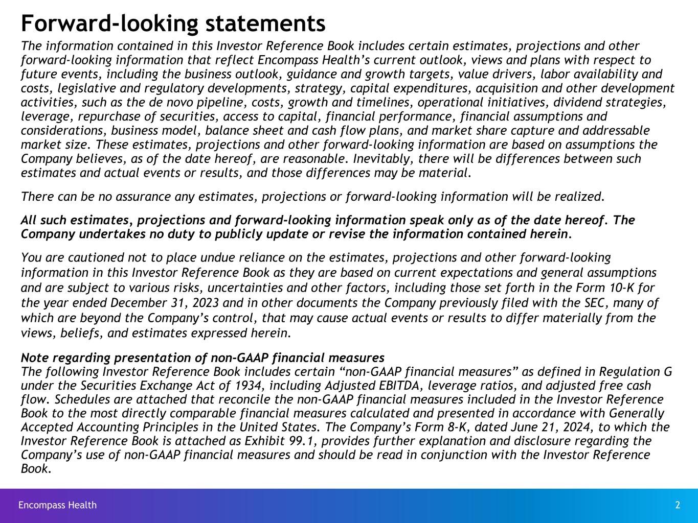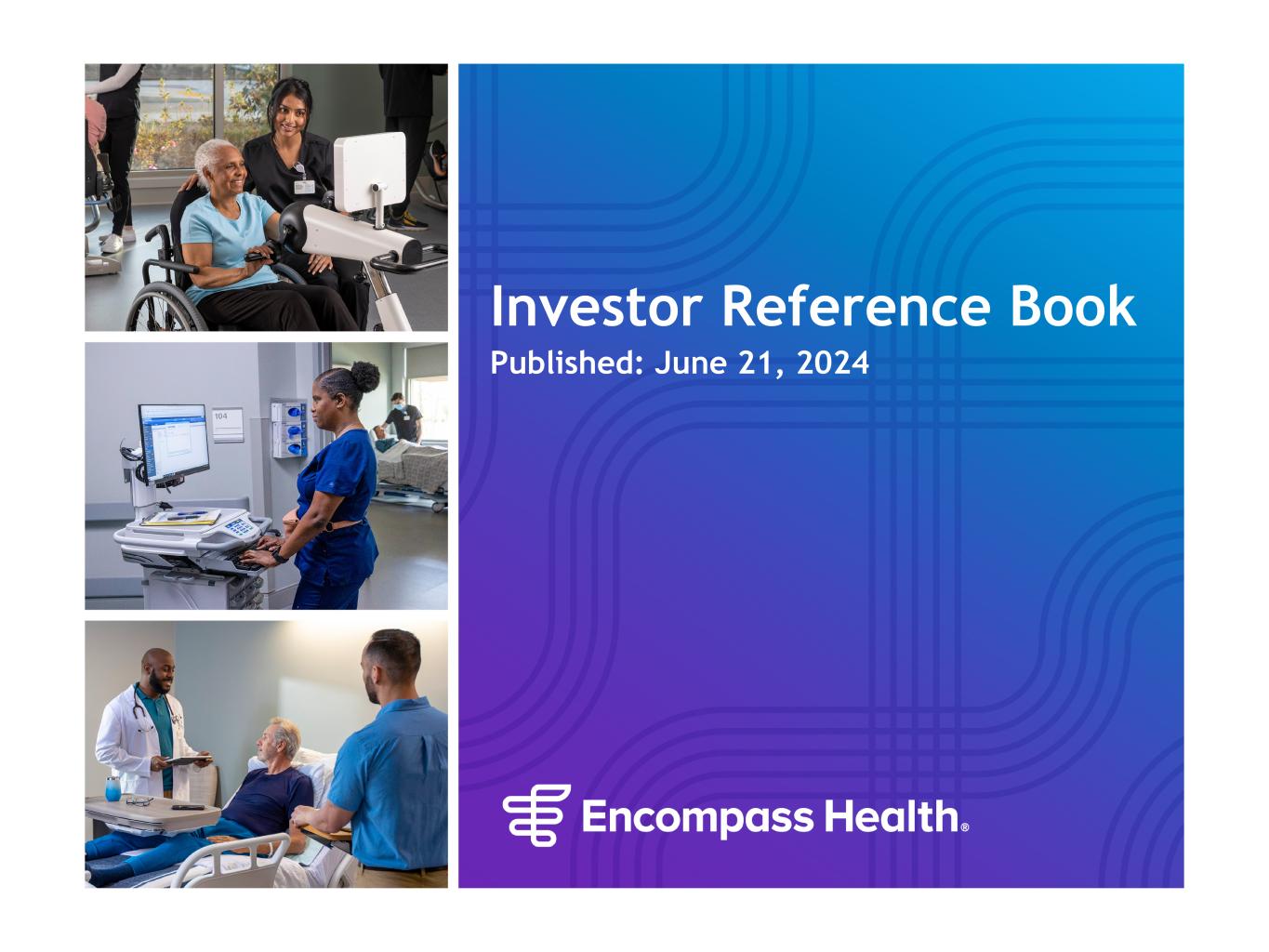 Encompass Health 2 Forward-looking statements The information contained in this Investor Reference Book includes certain estimates, projections and other forward-looking information that reflect Encompass Health’s current outlook, views and plans with respect to future events, including the business outlook, guidance and growth targets, value drivers, labor availability and costs, legislative and regulatory developments, strategy, capital expenditures, acquisition and other development activities, such as the de novo pipeline, costs, growth and timelines, operational initiatives, dividend strategies, leverage, repurchase of securities, access to capital, financial performance, financial assumptions and considerations, business model, balance sheet and cash flow plans, and market share capture and addressable market size. These estimates, projections and other forward-looking information are based on assumptions the Company believes, as of the date hereof, are reasonable. Inevitably, there will be differences between such estimates and actual events or results, and those differences may be material. There can be no assurance any estimates, projections or forward-looking information will be realized. All such estimates, projections and forward-looking information speak only as of the date hereof. The Company undertakes no duty to publicly update or revise the information contained herein. You are cautioned not to place undue reliance on the estimates, projections and other forward-looking information in this Investor Reference Book as they are based on current expectations and general assumptions and are subject to various risks, uncertainties and other factors, including those set forth in the Form 10-K for the year ended December 31, 2023 and in other documents the Company previously filed with the SEC, many of which are beyond the Company’s control, that may cause actual events or results to differ materially from the views, beliefs, and estimates expressed herein. Note regarding presentation of non-GAAP financial measures The following Investor Reference Book includes certain “non-GAAP financial measures” as defined in Regulation G under the Securities Exchange Act of 1934, including Adjusted EBITDA, leverage ratios, and adjusted free cash flow. Schedules are attached that reconcile the non-GAAP financial measures included in the Investor Reference Book to the most directly comparable financial measures calculated and presented in accordance with Generally Accepted Accounting Principles in the United States. The Company’s Form 8-K, dated June 21, 2024, to which the Investor Reference Book is attached as Exhibit 99.1, provides further explanation and disclosure regarding the Company’s use of non-GAAP financial measures and should be read in conjunction with the Investor Reference Book.