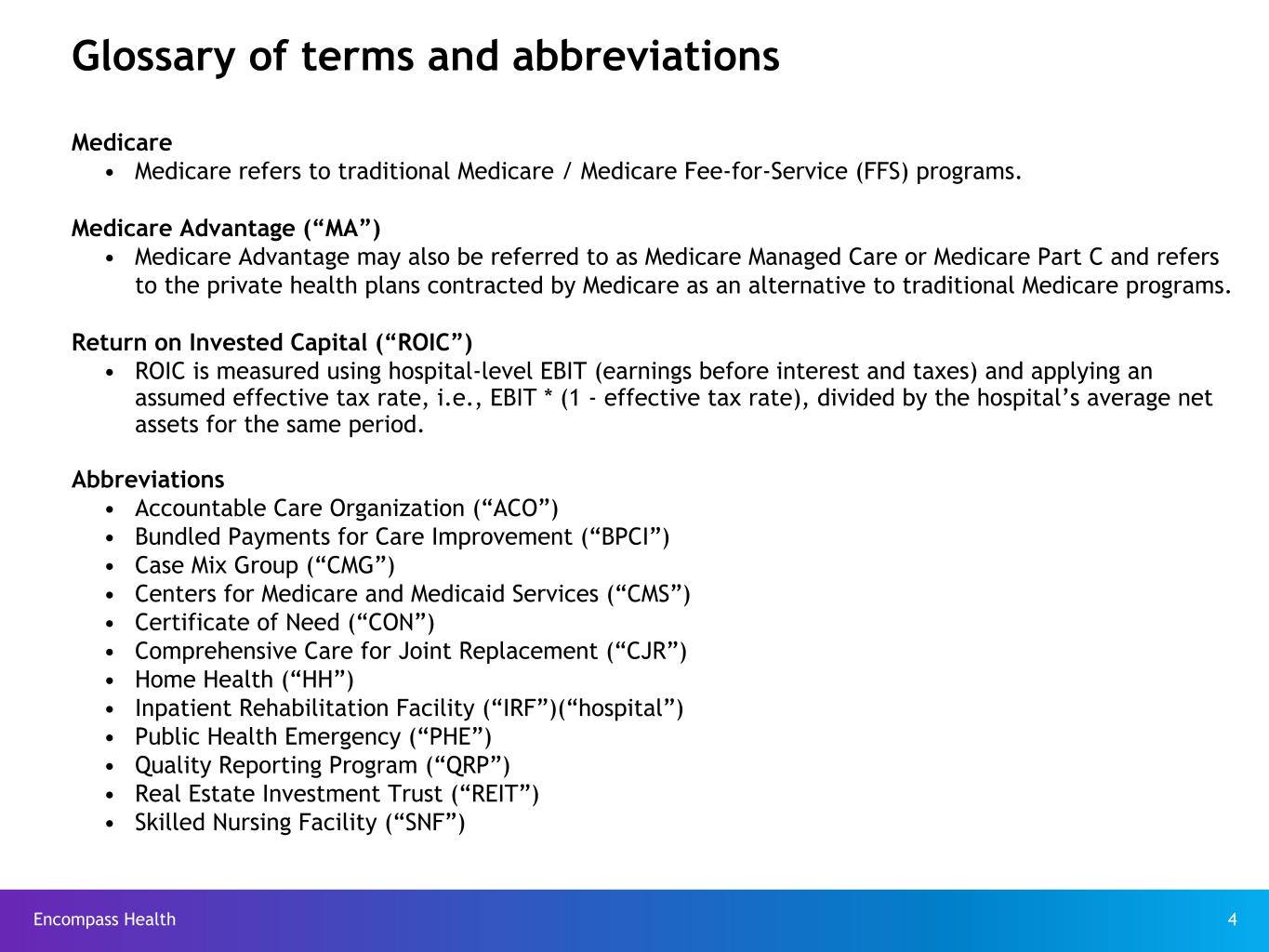 Encompass Health 3 Business outlook . . . . . . . . . . . . . . . . . . . . . . . . . . . . . . . . . . . . . . . . . . . . . . . . . . . . . . . . . . . . . . . . . . . 5-7 Company overview . . . . . . . . . . . . . . . . . . . . . . . . . . . . . . . . . . . . . . . . . . . . . . . . . . . . . . . . . . . . . . . . . 8-20 Industry overview . . . . . . . . . . . . . . . . . . . . . . . . . . . . . . . . . . . . . . . . . . . . . . . . . . . . . . . . . . . . . . . . . . 21-29 Growth . . . . . . . . . . . . . . . . . . . . . . . . . . . . . . . . . . . . . . . . . . . . . . . . . . . . . . . . . . . . . . . . . . . . . . . . . . . 30 Growth strategy . . . . . . . . . . . . . . . . . . . . . . . . . . . . . . . . . . . . . . . . . . . . . . . . . . . . . . . . . . . . . . . . 31-32 Market characteristics . . . . . . . . . . . . . . . . . . . . . . . . . . . . . . . . . . . . . . . . . . . . . . . . . . . . . . . . . . . 33-36 De novo development . . . . . . . . . . . . . . . . . . . . . . . . . . . . . . . . . . . . . . . . . . . . . . . . . . . . . . . . . . . 37-45 Bed additions . . . . . . . . . . . . . . . . . . . . . . . . . . . . . . . . . . . . . . . . . . . . . . . . . . . . . . . . . . . . . . . . . . 46 Operational initiatives . . . . . . . . . . . . . . . . . . . . . . . . . . . . . . . . . . . . . . . . . . . . . . . . . . . . . . . . . . . . . 47-56 Information technology . . . . . . . . . . . . . . . . . . . . . . . . . . . . . . . . . . . . . . . . . . . . . . . . . . . . . . . . . . . . . 57-61 Reconciliations to GAAP . . . . . . . . . . . . . . . . . . . . . . . . . . . . . . . . . . . . . . . . . . . . . . . . . . . . . . . . . . . . 62-65 End Notes . . . . . . . . . . . . . . . . . . . . . . . . . . . . . . . . . . . . . . . . . . . . . . . . . . . . . . . . . . . . . . . . . . . . . . . . . 66-68 Table of contents