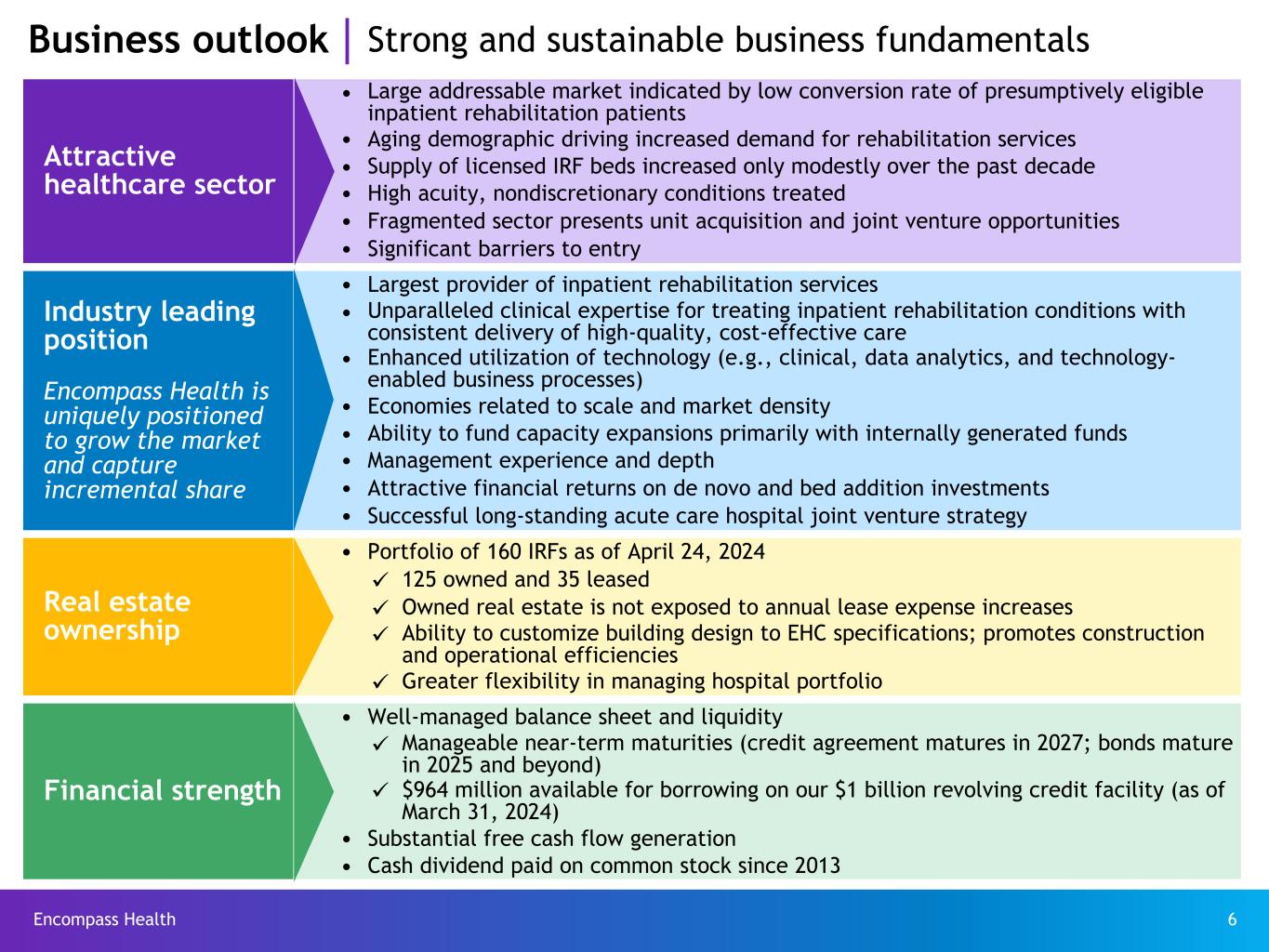 Encompass Health 6 Attractive healthcare sector Ÿ Large addressable market indicated by low conversion rate of presumptively eligible inpatient rehabilitation patients Ÿ Aging demographic driving increased demand for rehabilitation services Ÿ Supply of licensed IRF beds increased only modestly over the past decade Ÿ High acuity, nondiscretionary conditions treated Ÿ Fragmented sector presents unit acquisition and joint venture opportunities Ÿ Significant barriers to entry Industry leading position Encompass Health is uniquely positioned to grow the market and capture incremental share Ÿ Largest provider of inpatient rehabilitation services Ÿ Unparalleled clinical expertise for treating inpatient rehabilitation conditions with consistent delivery of high-quality, cost-effective care Ÿ Enhanced utilization of technology (e.g., clinical, data analytics, and technology- enabled business processes) Ÿ Economies related to scale and market density Ÿ Ability to fund capacity expansions primarily with internally generated funds Ÿ Management experience and depth Ÿ Attractive financial returns on de novo and bed addition investments Ÿ Successful long-standing acute care hospital joint venture strategy Real estate ownership Ÿ Portfolio of 160 IRFs as of April 24, 2024 ü 125 owned and 35 leased ü Owned real estate is not exposed to annual lease expense increases ü Ability to customize building design to EHC specifications; promotes construction and operational efficiencies ü Greater flexibility in managing hospital portfolio Financial strength Ÿ Well-managed balance sheet and liquidity ü Manageable near-term maturities (credit agreement matures in 2027; bonds mature in 2025 and beyond) ü $964 million available for borrowing on our $1 billion revolving credit facility (as of March 31, 2024) Ÿ Substantial free cash flow generation Ÿ Cash dividend paid on common stock since 2013 Business outlook Strong and sustainable business fundamentals
