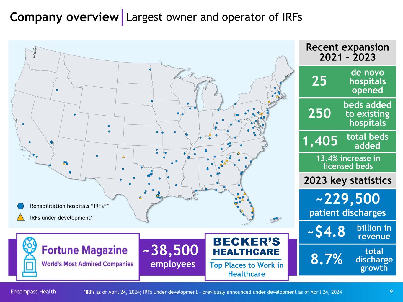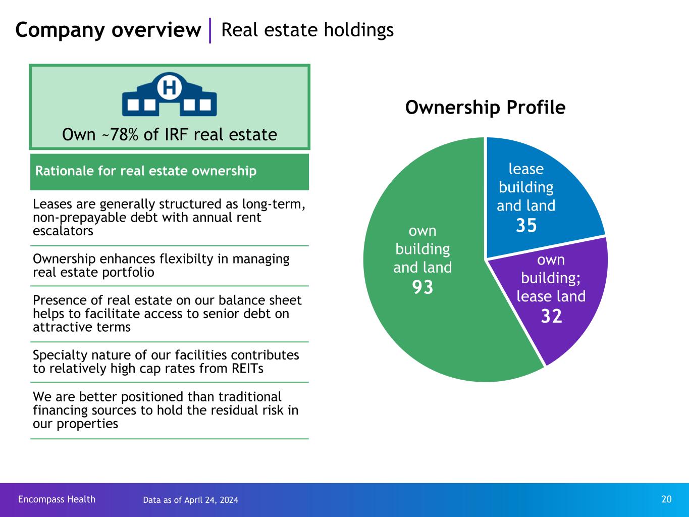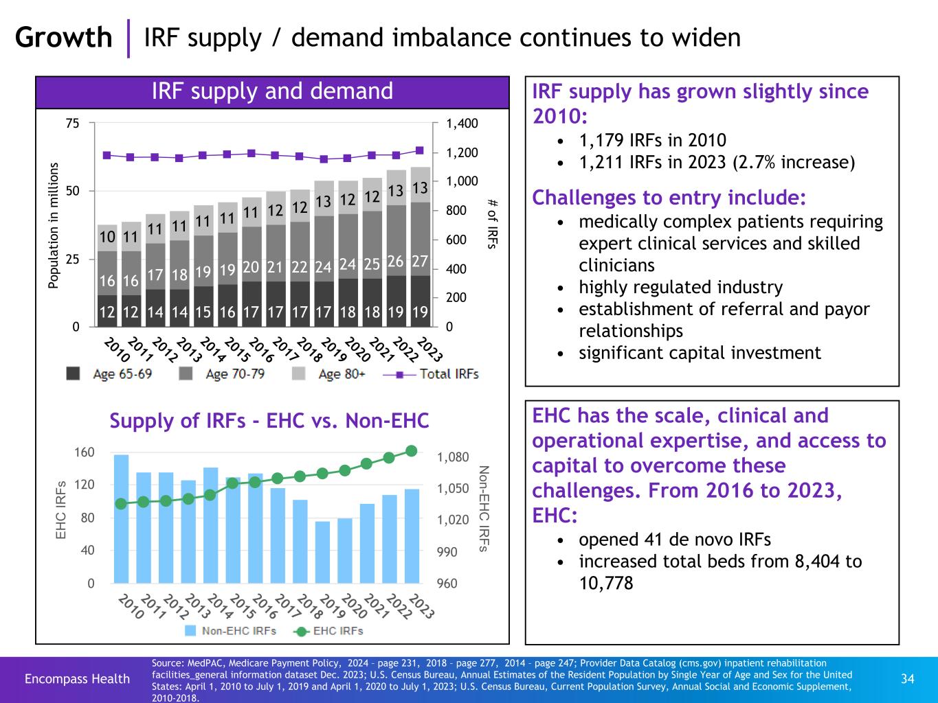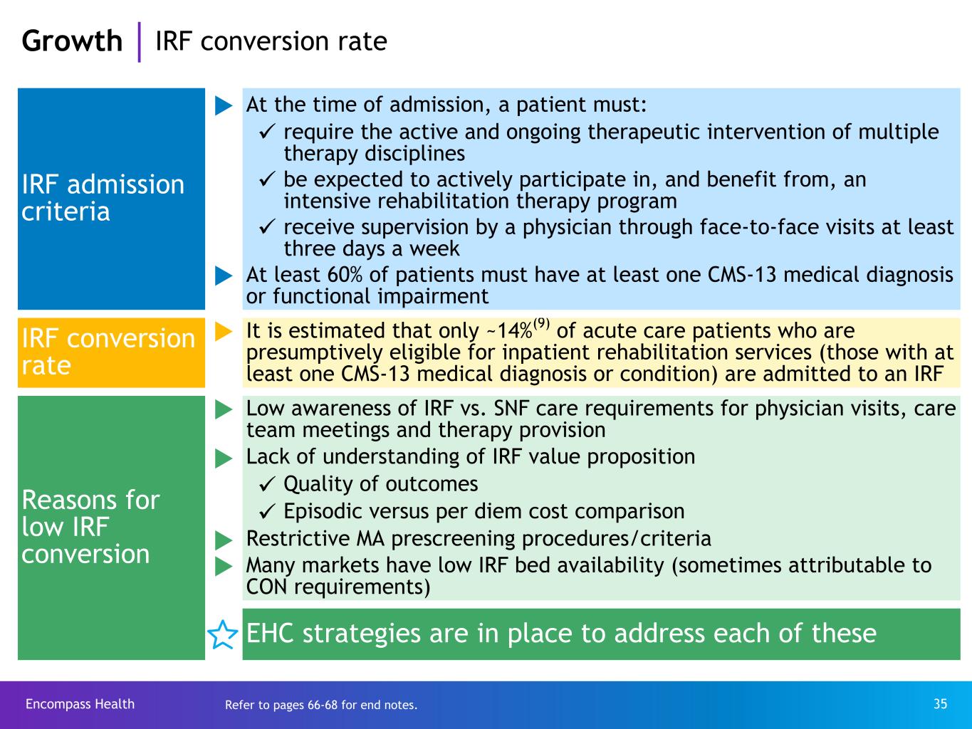 Encompass Health 34 Po pu la ti on in m ill io ns # of IRFs 12 12 14 14 15 16 17 17 17 17 18 18 19 19 16 16 17 18 19 19 20 21 22 24 24 25 26 27 10 11 11 11 11 11 11 12 12 13 12 12 13 13 2010 2011 2012 2013 2014 2015 2016 2017 2018 2019 2020 2021 2022 2023 0 25 50 75 0 200 400 600 800 1,000 1,200 1,400 IRF supply and demand Source: MedPAC, Medicare Payment Policy, 2024 – page 231, 2018 – page 277, 2014 – page 247; Provider Data Catalog (cms.gov) inpatient rehabilitation facilities_general information dataset Dec. 2023; U.S. Census Bureau, Annual Estimates of the Resident Population by Single Year of Age and Sex for the United States: April 1, 2010 to July 1, 2019 and April 1, 2020 to July 1, 2023; U.S. Census Bureau, Current Population Survey, Annual Social and Economic Supplement, 2010-2018. Growth IRF supply / demand imbalance continues to widen E H C IR Fs N on-E H C IR Fs 2010 2011 2012 2013 2014 2015 2016 2017 2018 2019 2020 2021 2022 2023 0 40 80 120 160 960 990 1,020 1,050 1,080 Supply of IRFs - EHC vs. Non-EHC IRF supply has grown slightly since 2010: • 1,179 IRFs in 2010 • 1,211 IRFs in 2023 (2.7% increase) Challenges to entry include: • medically complex patients requiring expert clinical services and skilled clinicians • highly regulated industry • establishment of referral and payor relationships • significant capital investment EHC has the scale, clinical and operational expertise, and access to capital to overcome these challenges. From 2016 to 2023, EHC: • opened 41 de novo IRFs • increased total beds from 8,404 to 10,778