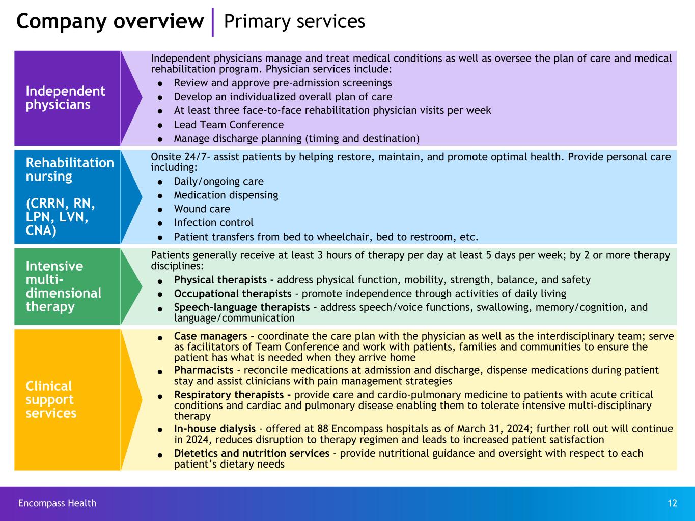 Encompass Health 12 Company overview Primary services Independent physicians Independent physicians manage and treat medical conditions as well as oversee the plan of care and medical rehabilitation program. Physician services include: Ÿ Review and approve pre-admission screenings Ÿ Develop an individualized overall plan of care Ÿ At least three face-to-face rehabilitation physician visits per week Ÿ Lead Team Conference Ÿ Manage discharge planning (timing and destination) Rehabilitation nursing (CRRN, RN, LPN, LVN, CNA) Onsite 24/7- assist patients by helping restore, maintain, and promote optimal health. Provide personal care including: Ÿ Daily/ongoing care Ÿ Medication dispensing Ÿ Wound care Ÿ Infection control Ÿ Patient transfers from bed to wheelchair, bed to restroom, etc. Intensive multi- dimensional therapy Patients generally receive at least 3 hours of therapy per day at least 5 days per week; by 2 or more therapy disciplines: Ÿ Physical therapists - address physical function, mobility, strength, balance, and safety Ÿ Occupational therapists - promote independence through activities of daily living Ÿ Speech-language therapists - address speech/voice functions, swallowing, memory/cognition, and language/communication Clinical support services Ÿ Case managers - coordinate the care plan with the physician as well as the interdisciplinary team; serve as facilitators of Team Conference and work with patients, families and communities to ensure the patient has what is needed when they arrive home Ÿ Pharmacists - reconcile medications at admission and discharge, dispense medications during patient stay and assist clinicians with pain management strategies Ÿ Respiratory therapists - provide care and cardio-pulmonary medicine to patients with acute critical conditions and cardiac and pulmonary disease enabling them to tolerate intensive multi-disciplinary therapy Ÿ In-house dialysis - offered at 88 Encompass hospitals as of March 31, 2024; further roll out will continue in 2024, reduces disruption to therapy regimen and leads to increased patient satisfaction Ÿ Dietetics and nutrition services - provide nutritional guidance and oversight with respect to each patient’s dietary needs