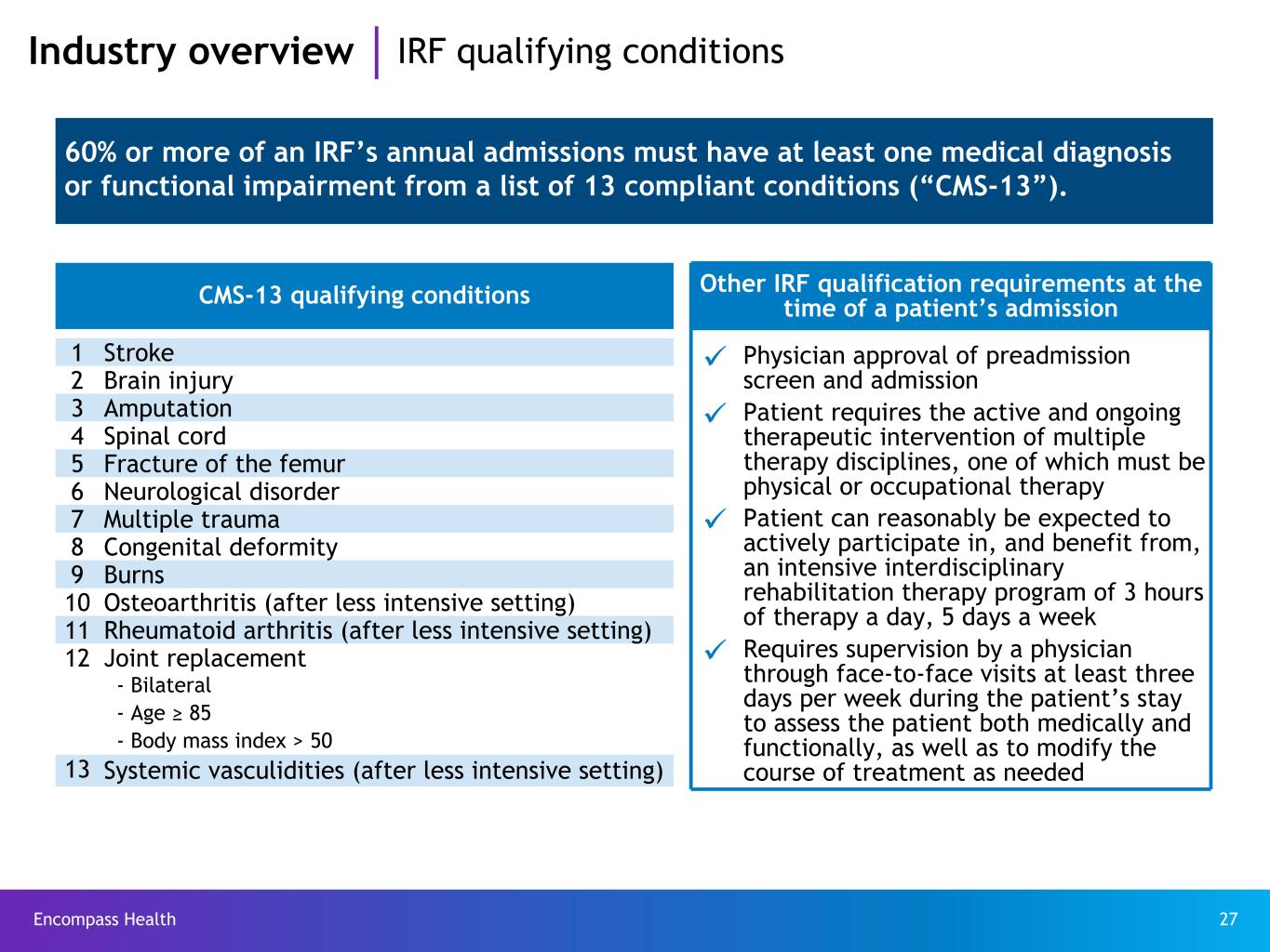 Encompass Health 26 (P er ce nt ) 1.6% 1.5% 1.5% 1.6% 1.5% 1.6% 1.6% 1.6% 1.6% 1.7% 1.3% 1.7% 1.8% 2010 2011 2012 2013 2014 2015 2016 2017 2018 2019 2020 2021 2022 2002 2003 2004 2005 2006 2007 2008 2009 2010 2011 2012 2013 2014 2015 2016 2017 2018 2019 2020 2021 2022 $0 $5 $10 $15 $20 $25 $30 $35 Percent of total Medicare FFS spending on inpatient rehabilitation Medicare spending on post-acute services Source: MedPAC, Medicare Payment Policy, March 2024 – pages 163, 201 and 225 Centers for Medicare and Medicaid Services, Medicare Trustees’ Report 2023 - page 13. * Not all home health spending occurs as a post-acute service. Industry overview Medicare spending on post-acute services Post-acute setting 2002 Spending 2022 Spending Skilled nursing facilities $14.8 $29.0 Home health agencies* $9.6 $16.1 Inpatient rehabilitation hospitals $5.7 $8.8 Medicare spent ~ $54 billion on post-acute services in 2022 (IRF, SNF, HH) $ in billions