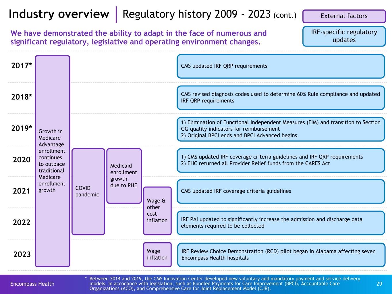 Encompass Health 28 Industry overview Regulatory history 2009 - 2023 We have demonstrated the ability to adapt in the face of numerous and significant regulatory, legislative and operating environment changes. 2009 2010 2011 2012 - 2013 2014* 2015* Global recession External factors IRF-specific regulatory updates 75% Rule permanently changed to 60% Rule with passage of “Medicare, Medicaid & SCHIP Extension Act of 2007” and paid for through a Medicare price rollback & 18-month freeze from 4/1/2008 to 9/30/2009 1) Passing of the ACA 2) CMS IRF Rule implemented new requirements for determining whether IRF claim is reasonable and necessary 1) Budget Control Act generates automatic 2% reduction in Medicare payments beginning in 2013 (sequestration) 2) Medicare Shared Savings Program (MSSP) ACO begins IRF Quality Reporting Program (IRF QRP) requires IRFs to report quality data with financial penalties for compliance issues CMS revised diagnosis codes that count toward 60% Rule * Between 2014 and 2019, the CMS Innovation Center developed new voluntary and mandatory payment and service delivery models, in accodance with legislation, such as Bundled Payments for Care Improvement (BPCI), Accountable Care Organizations (ACO), and Comprehensive Care for Joint Replacement Model (CJR). 1) IMPACT Act directed CMS to create rules requiring the collection and reporting of standard patient assessment data 2) Original BPCI begins Medicaid expansion due to the passing of the Patient Protection and Affordable Care Act (ACA) Medicare Advantage enrollment outpaces traditional Medicare enrollment growth 2016* 1) CJR becomes mandatory in certain markets 2) Next Gen ACO begins