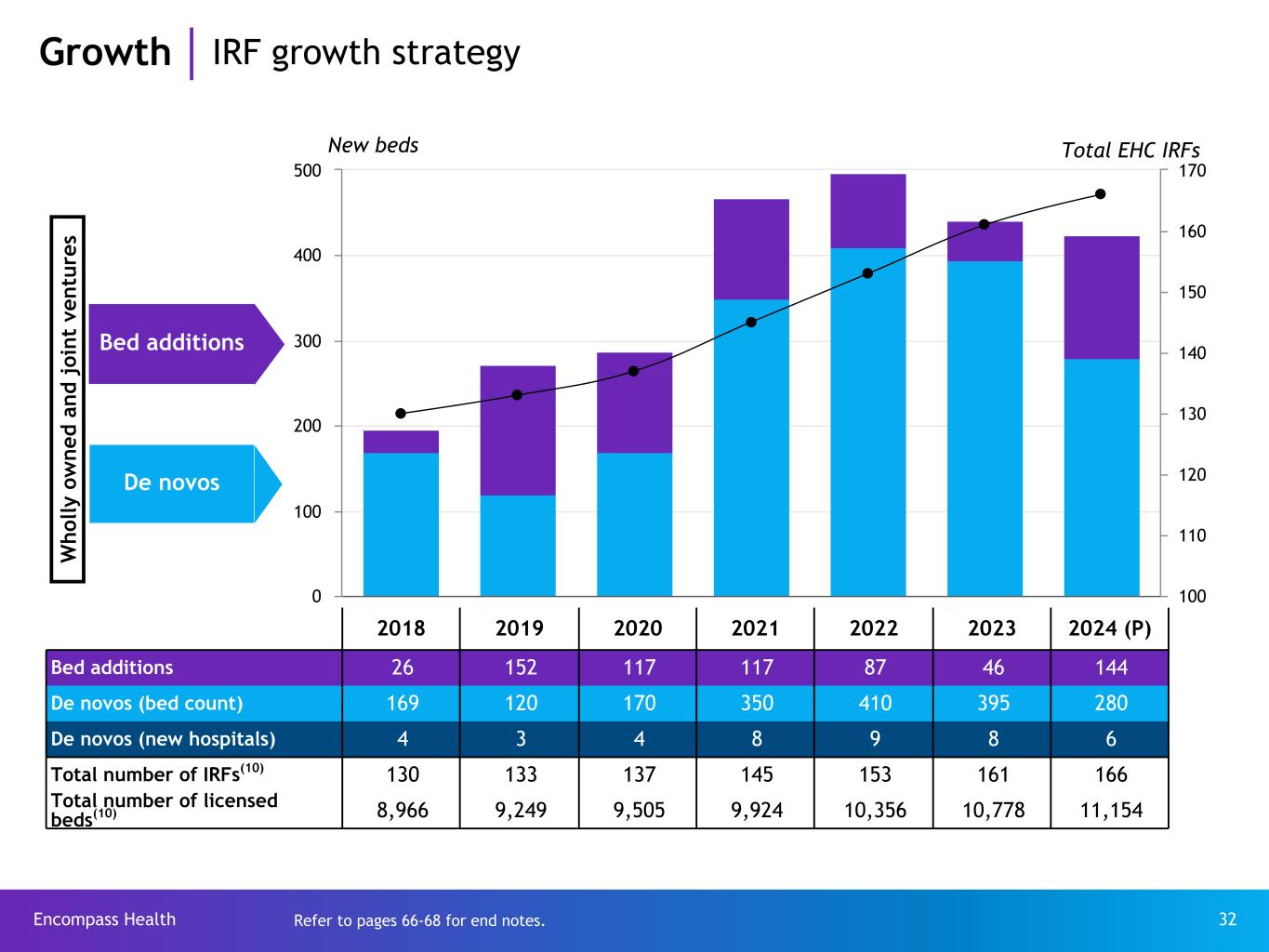 Encompass Health 31 Growth Our rationale for continued expansion of IRF capacity Large, under penetrated and growing market Ÿ ~14% estimated national conversion rate to IRF(9) Ÿ Aging demographic (~5% population growth CAGR for our average age patient) Ÿ Supply of licensed IRF beds has increased only 2.7% since 2010 Ÿ SNF disintermediation opportunity Ÿ Non-discretionary conditions Significant barriers to entry and competitive advantages Ÿ Clinical expertise Ÿ Access to capital Ÿ Economies of scale Ÿ Regulatory and compliance knowledge and infrastructure Ÿ Long history of successful acute care hospital joint ventures Ÿ Relationships with referral sources and payors Ÿ Nationally known and highly regarded brand Attractive financial returns on de novos and bed additions Ÿ Fuels revenue and EBITDA growth Ÿ Attractive ROIC Ÿ Significant operating leverage in bed addition strategy Ÿ Future period bed additions can increase de novo returns Refer to pages 66-68 for end notes.