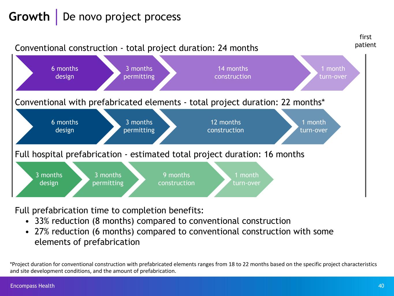 Encompass Health 39 • Prototype hospital includes all private rooms • Core infrastructure of building anticipates future expansion (accretive to financial returns) • Factors that impact costs/timeline: ◦ CON status ◦ State regulatory requirements ◦ Local planning and zoning approvals ◦ Other location- or hospital-specific complexities CON process (if applicable) Zoning & design Permitting Construction OpeningGroundbreaking Capital cost ($ in millions) 2022-2023 2023-2024 Construction, design, permitting, etc. $35.0 $44.0 Land 5.5 5.0 Equipment (including CIS) 5.5 5.5 Cost of a typical 50-bed IRF $46.0 $54.5 Pre-opening & ramp up costs* ($ in millions) Operating $1.0 $1.0 Salaries, wages, benefits 1.0 1.5 $2.0 $2.5 Project start 18 to 22 months6 months to 3 years Illustrative timeline *Pre-opening expenses include expenses for pre-opening hires, training and other general operating costs incurred prior to the first patient’s admission. The costs for this purpose is not inclusive of any revenues generated during the first month of operation. Growth De novo costs and timeline Amounts are the average per hospital capital costs based on actual costs for EHC’s 2022 and 2023 50-bed hospitals and the projected costs for EHC’s 2024 50-bed hospitals. The pricing for these projects is based on contracts established up to two years prior to hospital opening and may not fully represent inflationary pressures in the current market.