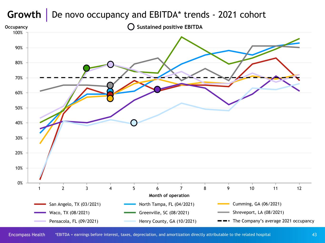 Encompass Health 43 Month of operation 1 2 3 4 5 6 7 8 9 10 11 12 0% 10% 20% 30% 40% 50% 60% 70% 80% 90% 100% Occupancy Sustained positive EBITDA *EBITDA = earnings before interest, taxes, depreciation, and amortization directly attributable to the related hospital Growth De novo occupancy and EBITDA* trends - 2021 cohort San Angelo, TX (03/2021) Waco, TX (08/2021) Pensacola, FL (09/2021) North Tampa, FL (04/2021) Greenville, SC (08/2021) Henry County, GA (10/2021) Cumming, GA (06/2021) Shreveport, LA (08/2021) The Company’s average 2021 occupancy