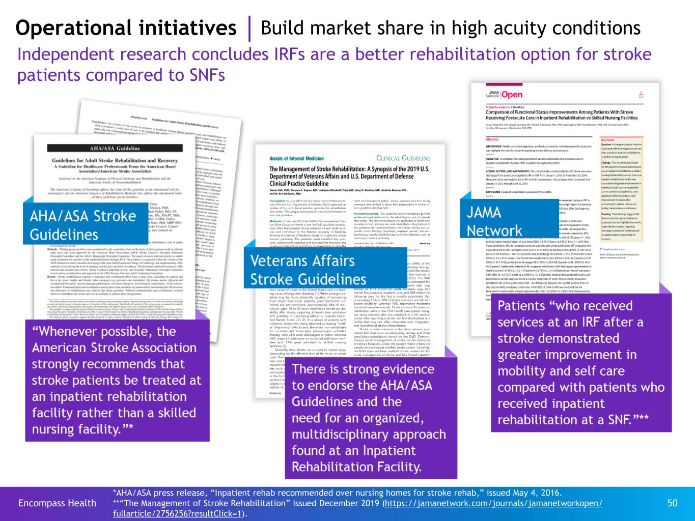 Encompass Health 50 Operational initiatives Build market share in high acuity conditions Independent research concludes IRFs are a better rehabilitation option for stroke patients compared to SNFs *AHA/ASA press release, “Inpatient rehab recommended over nursing homes for stroke rehab,” issued May 4, 2016. **“The Management of Stroke Rehabilitation” issued December 2019 (https://jamanetwork.com/journals/jamanetworkopen/ fullarticle/2756256?resultClick=1).