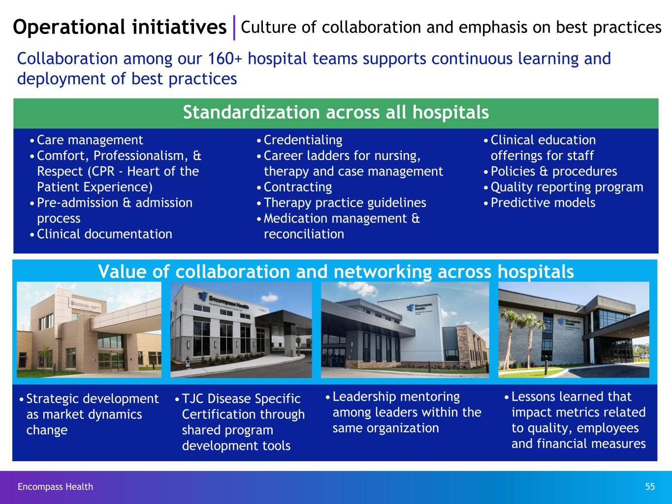 Encompass Health 55 Operational initiatives Culture of collaboration and emphasis on best practices Collaboration among our 160+ hospital teams supports continuous learning and deployment of best practices •Strategic development as market dynamics change Standardization across all hospitals Value of collaboration and networking across hospitals •Care management •Comfort, Professionalism, & Respect (CPR - Heart of the Patient Experience) •Pre-admission & admission process •Clinical documentation •Credentialing •Career ladders for nursing, therapy and case management •Contracting •Therapy practice guidelines •Medication management & reconciliation •Clinical education offerings for staff •Policies & procedures •Quality reporting program •Predictive models •TJC Disease Specific Certification through shared program development tools •Leadership mentoring among leaders within the same organization •Lessons learned that impact metrics related to quality, employees and financial measures