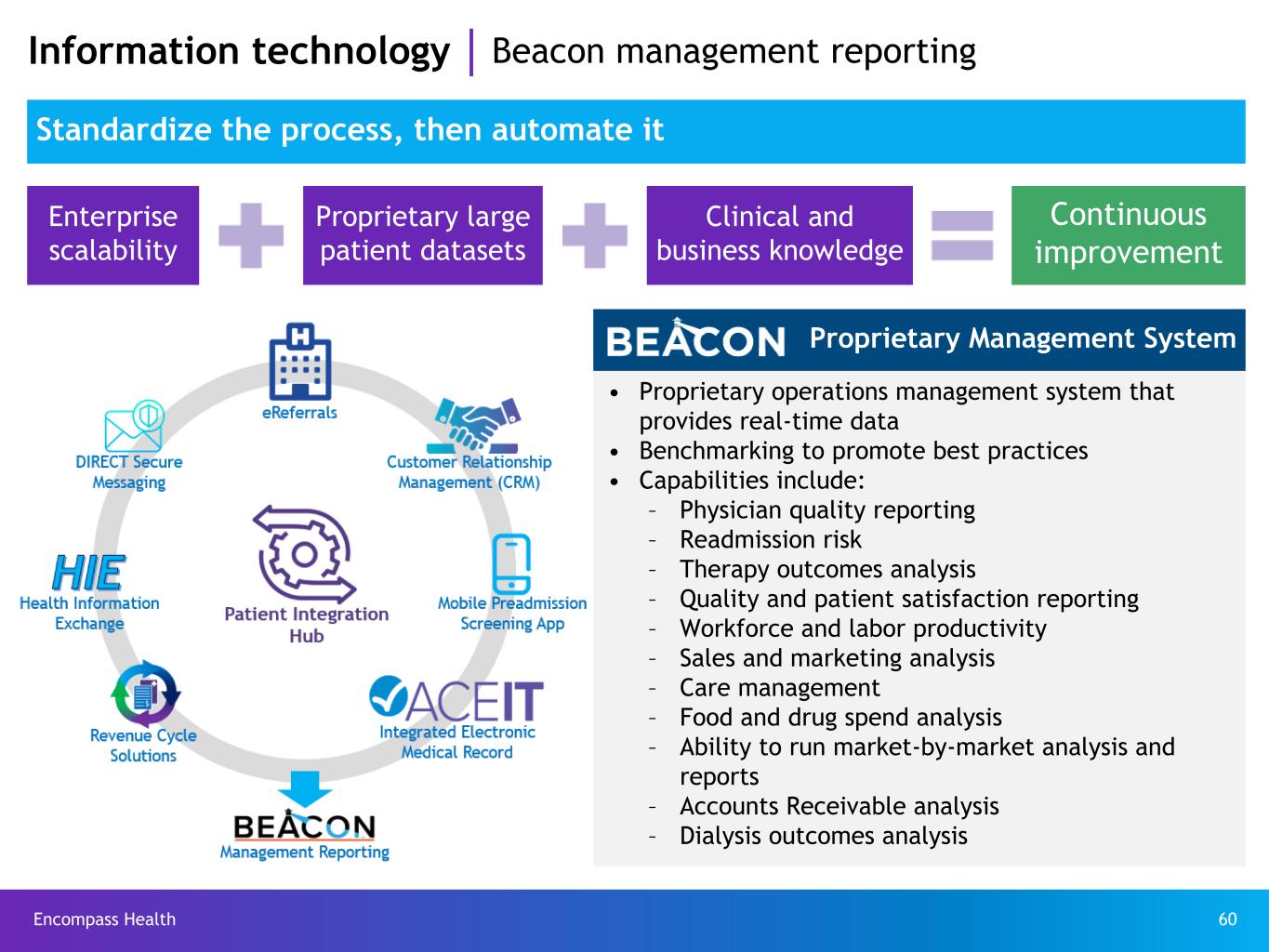 Encompass Health 59 Information technology Clinical information system 2010 - Our first hospital went live with the Cerner EMR system 2012 - We began a five year rollout to every hospital Benefits: •Patient outcomes and safety •Operational efficiencies •Cost effectiveness •Change agility