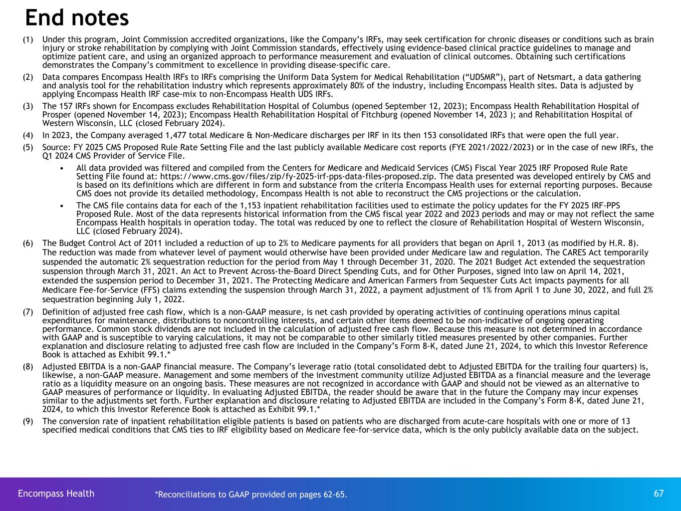Encompass Health 67 (1) Under this program, Joint Commission accredited organizations, like the Company’s IRFs, may seek certification for chronic diseases or conditions such as brain injury or stroke rehabilitation by complying with Joint Commission standards, effectively using evidence-based clinical practice guidelines to manage and optimize patient care, and using an organized approach to performance measurement and evaluation of clinical outcomes. Obtaining such certifications demonstrates the Company’s commitment to excellence in providing disease-specific care. (2) Data compares Encompass Health IRFs to IRFs comprising the Uniform Data System for Medical Rehabilitation (“UDSMR”), part of Netsmart, a data gathering and analysis tool for the rehabilitation industry which represents approximately 80% of the industry, including Encompass Health sites. Data is adjusted by applying Encompass Health IRF case-mix to non-Encompass Health UDS IRFs. (3) The 157 IRFs shown for Encompass excludes Rehabilitation Hospital of Columbus (opened September 12, 2023); Encompass Health Rehabilitation Hospital of Prosper (opened November 14, 2023); Encompass Health Rehabilitation Hospital of Fitchburg (opened November 14, 2023 ); and Rehabilitation Hospital of Western Wisconsin, LLC (closed February 2024). (4) In 2023, the Company averaged 1,477 total Medicare & Non-Medicare discharges per IRF in its then 153 consolidated IRFs that were open the full year. (5) Source: FY 2025 CMS Proposed Rule Rate Setting File and the last publicly available Medicare cost reports (FYE 2021/2022/2023) or in the case of new IRFs, the Q1 2024 CMS Provider of Service File. • All data provided was filtered and compiled from the Centers for Medicare and Medicaid Services (CMS) Fiscal Year 2025 IRF Proposed Rule Rate Setting File found at: https://www.cms.gov/files/zip/fy-2025-irf-pps-data-files-proposed.zip. The data presented was developed entirely by CMS and is based on its definitions which are different in form and substance from the criteria Encompass Health uses for external reporting purposes. Because CMS does not provide its detailed methodology, Encompass Health is not able to reconstruct the CMS projections or the calculation. • The CMS file contains data for each of the 1,153 inpatient rehabilitation facilities used to estimate the policy updates for the FY 2025 IRF-PPS Proposed Rule. Most of the data represents historical information from the CMS fiscal year 2022 and 2023 periods and may or may not reflect the same Encompass Health hospitals in operation today. The total was reduced by one to reflect the closure of Rehabilitation Hospital of Western Wisconsin, LLC (closed February 2024). (6) The Budget Control Act of 2011 included a reduction of up to 2% to Medicare payments for all providers that began on April 1, 2013 (as modified by H.R. 8). The reduction was made from whatever level of payment would otherwise have been provided under Medicare law and regulation. The CARES Act temporarily suspended the automatic 2% sequestration reduction for the period from May 1 through December 31, 2020. The 2021 Budget Act extended the sequestration suspension through March 31, 2021. An Act to Prevent Across-the-Board Direct Spending Cuts, and for Other Purposes, signed into law on April 14, 2021, extended the suspension period to December 31, 2021. The Protecting Medicare and American Farmers from Sequester Cuts Act impacts payments for all Medicare Fee-for-Service (FFS) claims extending the suspension through March 31, 2022, a payment adjustment of 1% from April 1 to June 30, 2022, and full 2% sequestration beginning July 1, 2022. (7) Definition of adjusted free cash flow, which is a non-GAAP measure, is net cash provided by operating activities of continuing operations minus capital expenditures for maintenance, distributions to noncontrolling interests, and certain other items deemed to be non-indicative of ongoing operating performance. Common stock dividends are not included in the calculation of adjusted free cash flow. Because this measure is not determined in accordance with GAAP and is susceptible to varying calculations, it may not be comparable to other similarly titled measures presented by other companies. Further explanation and disclosure relating to adjusted free cash flow are included in the Company’s Form 8-K, dated June 21, 2024, to which this Investor Reference Book is attached as Exhibit 99.1.* (8) Adjusted EBITDA is a non-GAAP financial measure. The Company’s leverage ratio (total consolidated debt to Adjusted EBITDA for the trailing four quarters) is, likewise, a non-GAAP measure. Management and some members of the investment community utilize Adjusted EBITDA as a financial measure and the leverage ratio as a liquidity measure on an ongoing basis. These measures are not recognized in accordance with GAAP and should not be viewed as an alternative to GAAP measures of performance or liquidity. In evaluating Adjusted EBITDA, the reader should be aware that in the future the Company may incur expenses similar to the adjustments set forth. Further explanation and disclosure relating to Adjusted EBITDA are included in the Company’s Form 8-K, dated June 21, 2024, to which this Investor Reference Book is attached as Exhibit 99.1.* (9) The conversion rate of inpatient rehabilitation eligible patients is based on patients who are discharged from acute-care hospitals with one or more of 13 specified medical conditions that CMS ties to IRF eligibility based on Medicare fee-for-service data, which is the only publicly available data on the subject. End notes *Reconciliations to GAAP provided on pages 62-65.