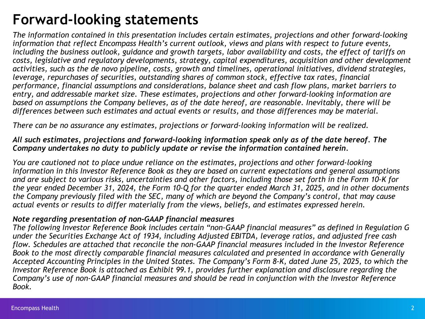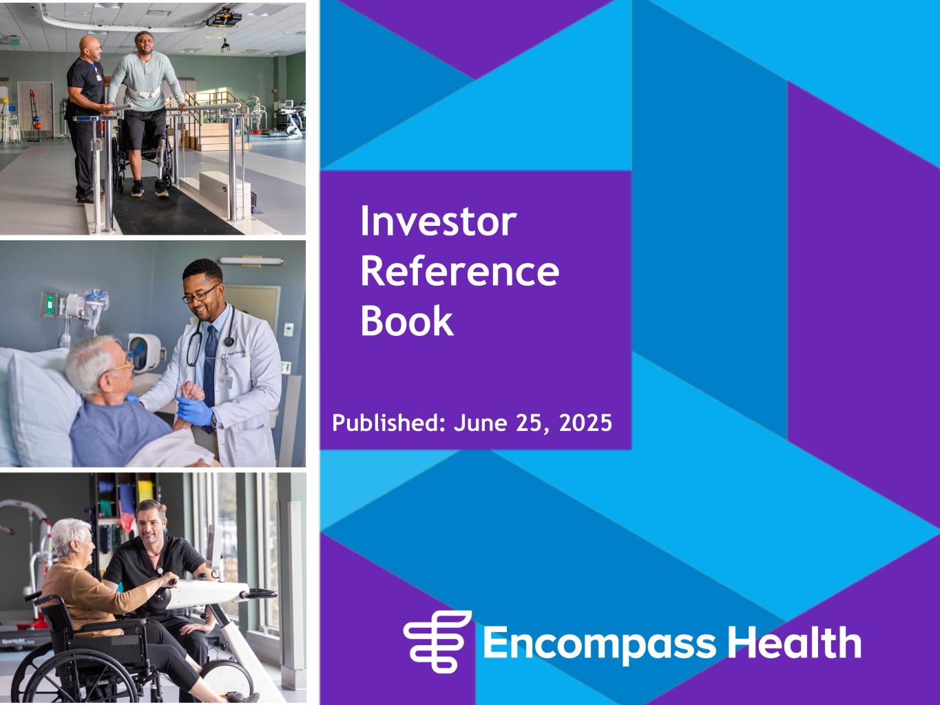 Encompass Health 2 Forward-looking statements The information contained in this presentation includes certain estimates, projections and other forward-looking information that reflect Encompass Health’s current outlook, views and plans with respect to future events, including the business outlook, guidance and growth targets, labor availability and costs, the effect of tariffs on costs, legislative and regulatory developments, strategy, capital expenditures, acquisition and other development activities, such as the de novo pipeline, costs, growth and timelines, operational initiatives, dividend strategies, leverage, repurchases of securities, outstanding shares of common stock, effective tax rates, financial performance, financial assumptions and considerations, balance sheet and cash flow plans, market barriers to entry, and addressable market size. These estimates, projections and other forward-looking information are based on assumptions the Company believes, as of the date hereof, are reasonable. Inevitably, there will be differences between such estimates and actual events or results, and those differences may be material. There can be no assurance any estimates, projections or forward-looking information will be realized. All such estimates, projections and forward-looking information speak only as of the date hereof. The Company undertakes no duty to publicly update or revise the information contained herein. You are cautioned not to place undue reliance on the estimates, projections and other forward-looking information in this Investor Reference Book as they are based on current expectations and general assumptions and are subject to various risks, uncertainties and other factors, including those set forth in the Form 10-K for the year ended December 31, 2024, the Form 10-Q for the quarter ended March 31, 2025, and in other documents the Company previously filed with the SEC, many of which are beyond the Company’s control, that may cause actual events or results to differ materially from the views, beliefs, and estimates expressed herein. Note regarding presentation of non-GAAP financial measures The following Investor Reference Book includes certain “non-GAAP financial measures” as defined in Regulation G under the Securities Exchange Act of 1934, including Adjusted EBITDA, leverage ratios, and adjusted free cash flow. Schedules are attached that reconcile the non-GAAP financial measures included in the Investor Reference Book to the most directly comparable financial measures calculated and presented in accordance with Generally Accepted Accounting Principles in the United States. The Company’s Form 8-K, dated June 25, 2025, to which the Investor Reference Book is attached as Exhibit 99.1, provides further explanation and disclosure regarding the Company’s use of non-GAAP financial measures and should be read in conjunction with the Investor Reference Book.
