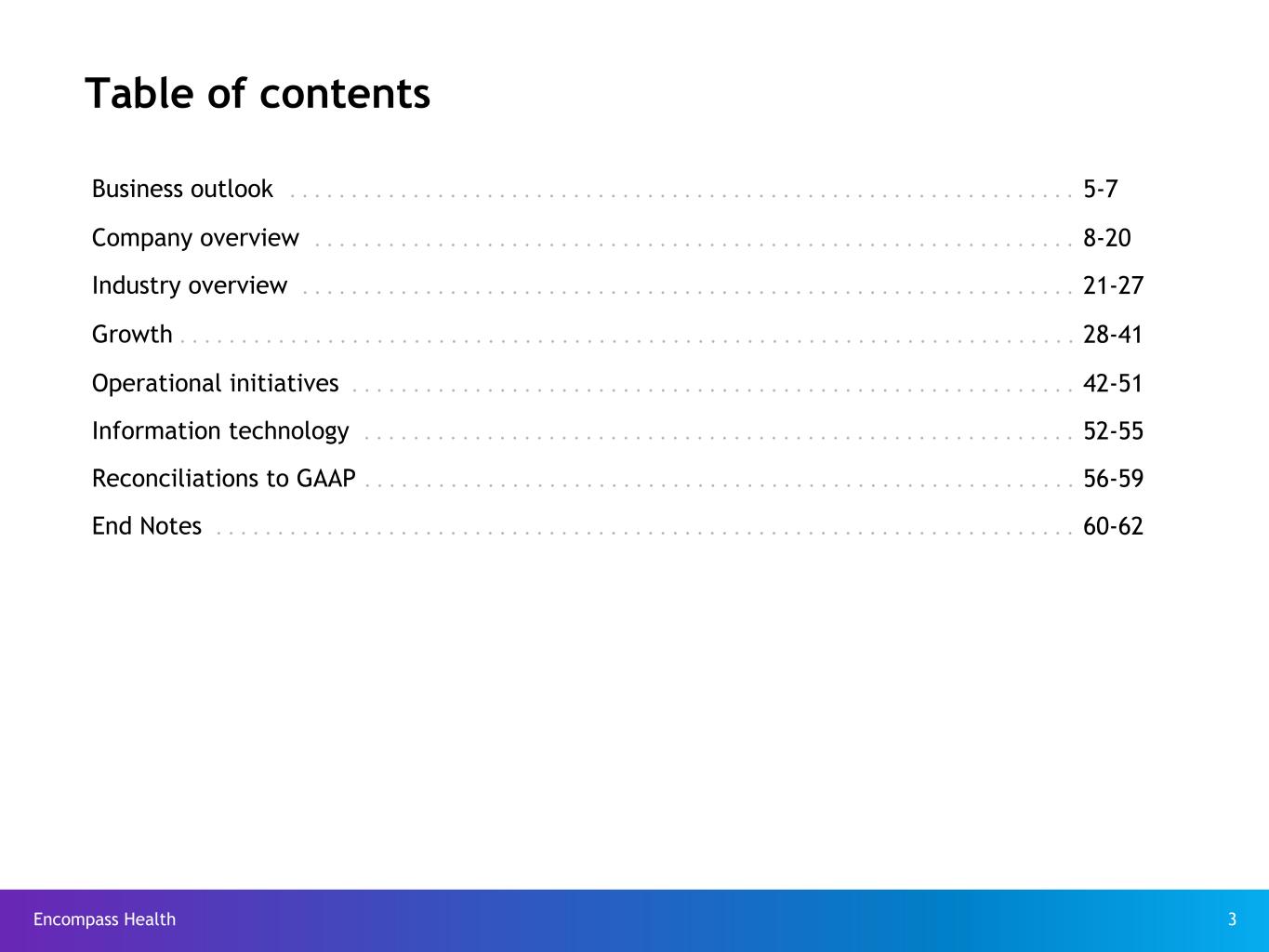 Encompass Health 3 Business outlook . . . . . . . . . . . . . . . . . . . . . . . . . . . . . . . . . . . . . . . . . . . . . . . . . . . . . . . . . . . . . . . . 5-7 Company overview . . . . . . . . . . . . . . . . . . . . . . . . . . . . . . . . . . . . . . . . . . . . . . . . . . . . . . . . . . . . . . 8-20 Industry overview . . . . . . . . . . . . . . . . . . . . . . . . . . . . . . . . . . . . . . . . . . . . . . . . . . . . . . . . . . . . . . . 21-27 Growth . . . . . . . . . . . . . . . . . . . . . . . . . . . . . . . . . . . . . . . . . . . . . . . . . . . . . . . . . . . . . . . . . . . . . . . . . 28-41 Operational initiatives . . . . . . . . . . . . . . . . . . . . . . . . . . . . . . . . . . . . . . . . . . . . . . . . . . . . . . . . . . . 42-51 Information technology . . . . . . . . . . . . . . . . . . . . . . . . . . . . . . . . . . . . . . . . . . . . . . . . . . . . . . . . . . 52-55 Reconciliations to GAAP . . . . . . . . . . . . . . . . . . . . . . . . . . . . . . . . . . . . . . . . . . . . . . . . . . . . . . . . . . 56-59 End Notes . . . . . . . . . . . . . . . . . . . . . . . . . . . . . . . . . . . . . . . . . . . . . . . . . . . . . . . . . . . . . . . . . . . . . . 60-62 Table of contents