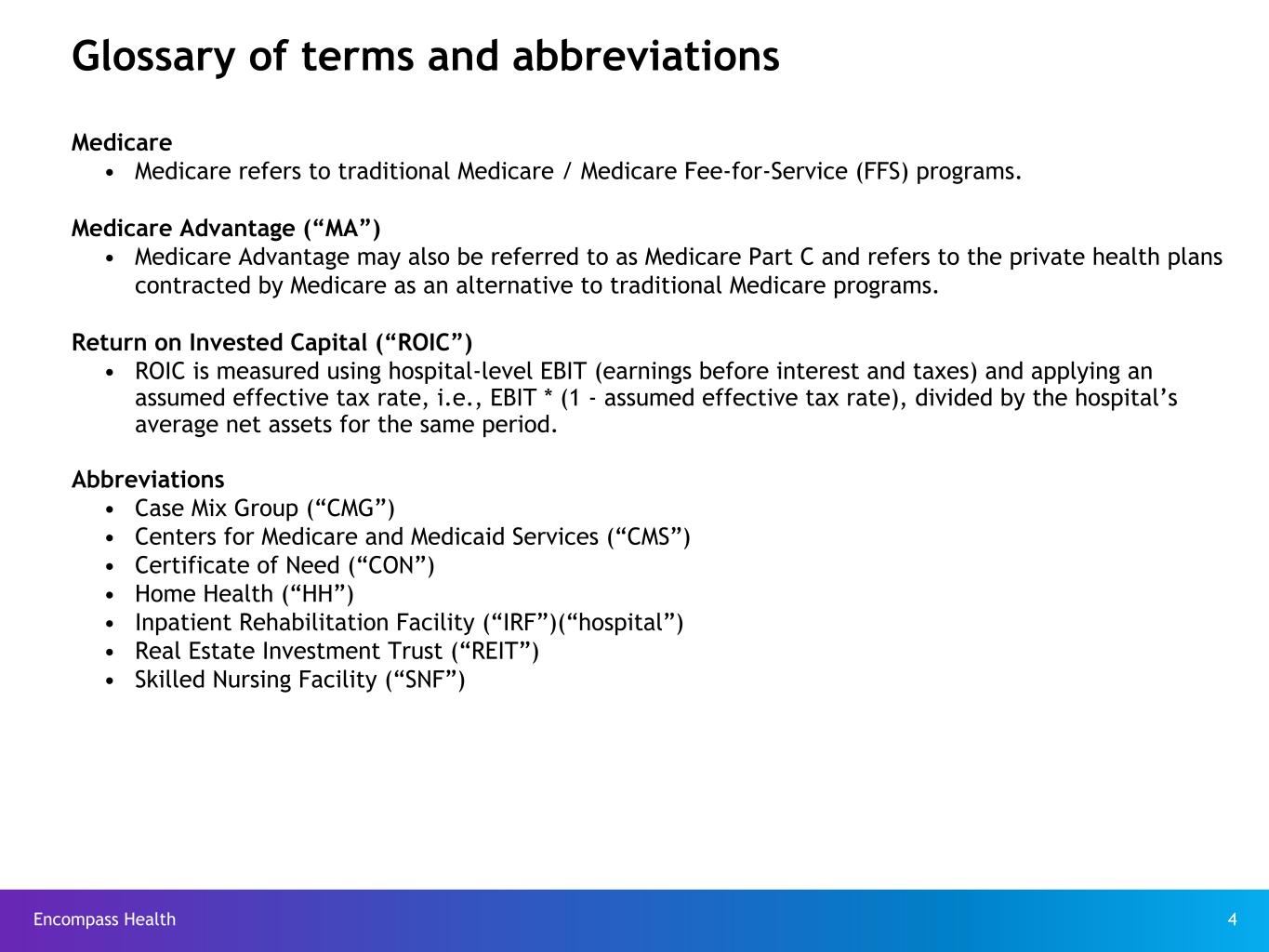 Encompass Health 4 Glossary of terms and abbreviations Medicare • Medicare refers to traditional Medicare / Medicare Fee-for-Service (FFS) programs. Medicare Advantage (“MA”) • Medicare Advantage may also be referred to as Medicare Part C and refers to the private health plans contracted by Medicare as an alternative to traditional Medicare programs. Return on Invested Capital (“ROIC”) • ROIC is measured using hospital-level EBIT (earnings before interest and taxes) and applying an assumed effective tax rate, i.e., EBIT * (1 - assumed effective tax rate), divided by the hospital’s average net assets for the same period. Abbreviations • Case Mix Group (“CMG”) • Centers for Medicare and Medicaid Services (“CMS”) • Certificate of Need (“CON”) • Home Health (“HH”) • Inpatient Rehabilitation Facility (“IRF”)(“hospital”) • Real Estate Investment Trust (“REIT”) • Skilled Nursing Facility (“SNF”)